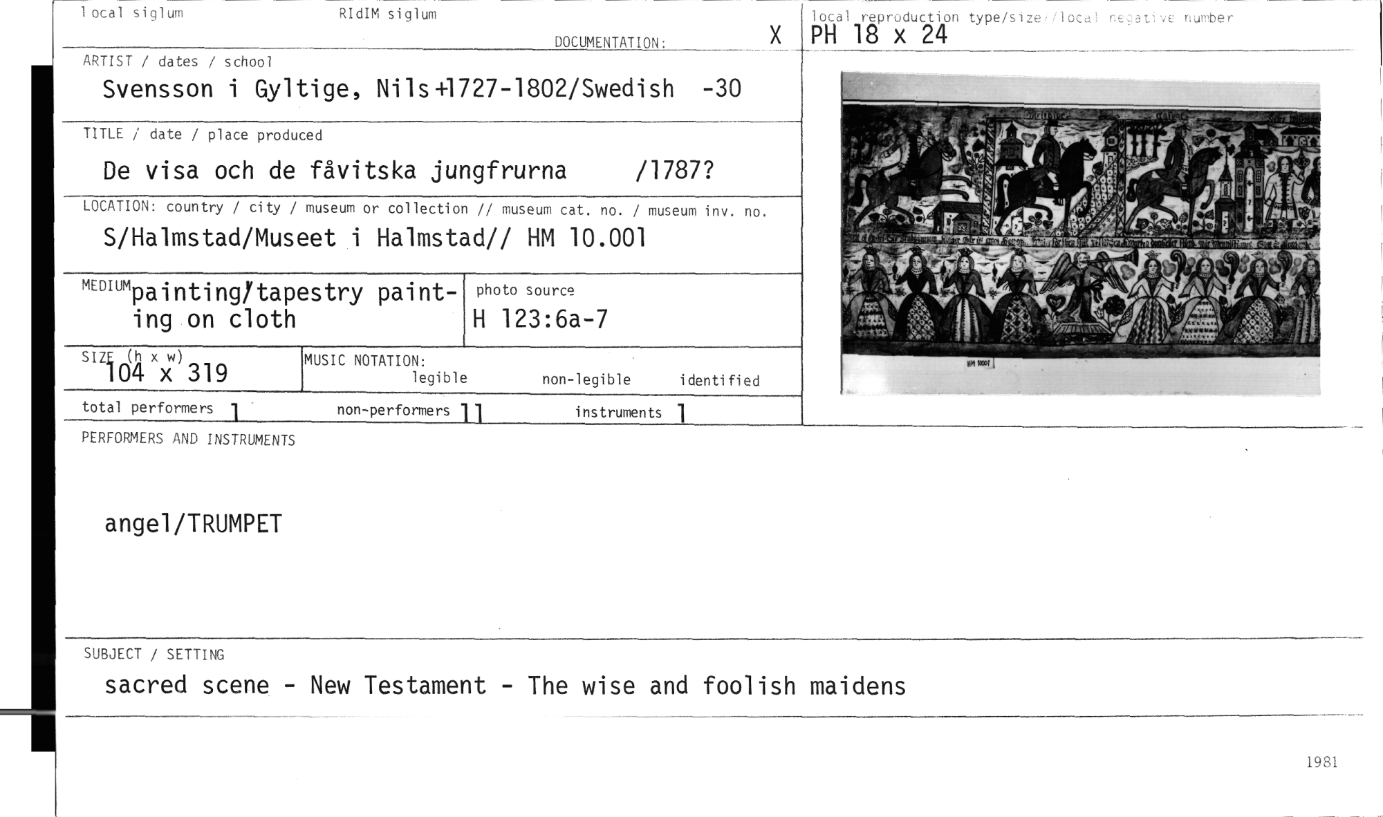 //// PERFORMERS AND INSTRUMENTS //// SIZE (h x w) //// 104 x 319 //// photo source //// H 123:6a-7 //// LOCATION: country / city / //// S/Halmstad/Mus //// museum or collection // museum cat. no. / museum inv. no. //// eet i Halmstad// HM 10.001 //// """paintingftap ing on cloth //// estry paint- //// total performers //// non-performers 1 1 instruments 1 //// 1 //// MUSIC NOTATION: //// legible //// non-legible identified //// local siglum RIdIM siglum //// DOCUMENTATION: //// ARTIST / dates / school //// Svensson i Gyltige, Nils11727-1802/Swedish -30 //// local reproduction type/size•,local re at e number //// PH 18 x 24 //// TITLE / date / place produced //// De visa och de fåvitska jungfrurna /1787? //// angel/TRUMPET //// SUBJECT / SETTING //// sacred scene - New Testament - The wise and foolish maidens //// 1981 ////