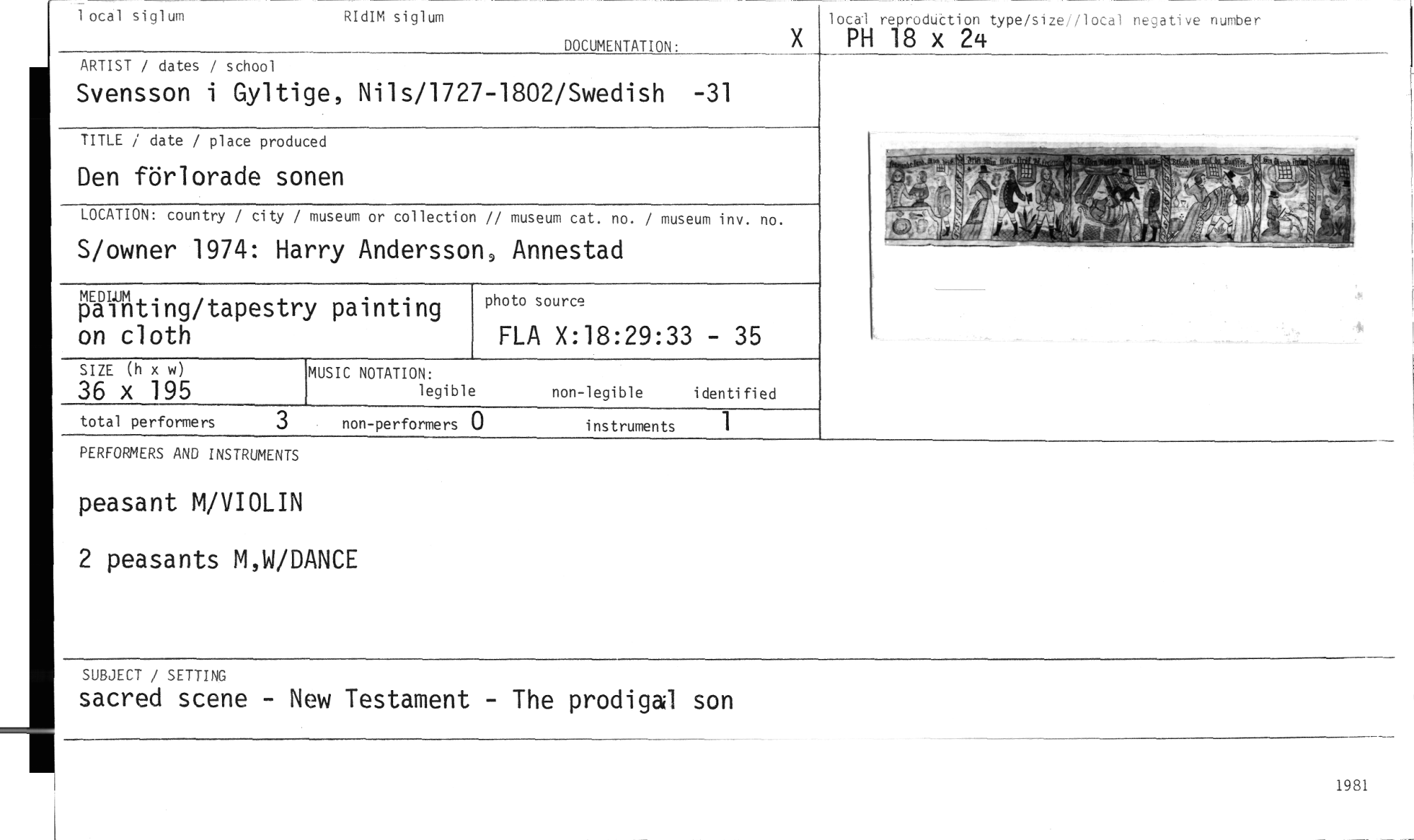 //// PERFORMERS AND INSTRUMENTS //// peasant M/VIOLIN //// 2 peasants M,W/DANCE //// SUBJECT / SETTING //// sacred scene - New Testament - The prodigail son //// 1 ocal siglum //// RIdIM siglum //// DOCUMENTATION: //// lotal repruduct on type/sizejloeal negative nutuber //// X PH 18 x 24 //// ARTIST / dates / school //// Svensson i Gyltige, Nils/1727-1802/Swedish -31 //// TITLE / date / place produced //// Den förlorade sonen //// LOCATION: country / city / museum or collection // museum cat. no. / museum inv. no. //// S/owner 1974: Harry Andersson, Annestad //// MEDLUM photo source //// painting/tapestry painting on cloth FLA X:18:29:33 - 35 //// //// SIZE (h x w) //// 36 x 195 //// MUSIC NOTATION: //// legible //// non-legible identified //// total performers 3 non-performers 0 instruments //// 1981 ////