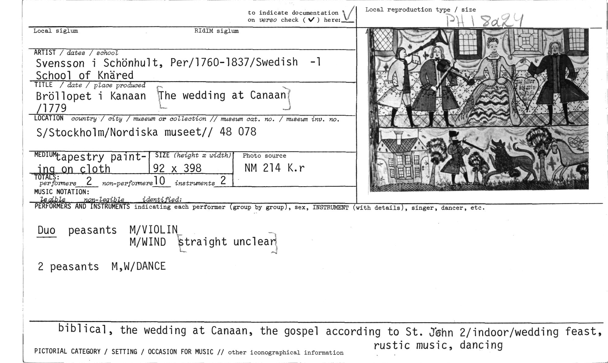 //// biblical, the wedding at Canaan, the gospel according to St. «thn 2/indoor/wedding feast, //// rustic music, dancing //// PICTORIAL CATEGORY / SETTING / OCCASION FOR MUSIC // other iconographical information //// to indicate documentation Local reproduction type / size //// on verso check (V) here:: I j //// Local siglum RIdIM siglum //// ARTIST / dates / school //// Svensson i Schönhult, Per/1760-1837/Swedish -1 School of Knäred //// TITLE / date / place produced //// Bröllopet i Kanaan 'The wedding at Canaan /1779 //// LOCATION country / city / museum or collection // museum cat. no. / museum inv. no. //// S/Stockholm/Nordiska museet// 48 078 //// MEM" - //// .1.dpestry paint- SIZE (height x width) //// on -loth 92 x 398 //// • //// ÅTnA : //// per formers 2 non-per formers] 0 instruments 2 //// Photo source //// NM 214 K.r //// MUSIC NOTATION: //// le4ible non-legible identift:ed; //// PERFORMERS AND INSTRUMENTS indicating each performer (group by group), sex, INSTRUMENT //// Duo peasants M/VIOLIN //// M/WIND straight unclea //// 2 peasants M,W/DANCE //// (with details), singer, dancer, etc. ////