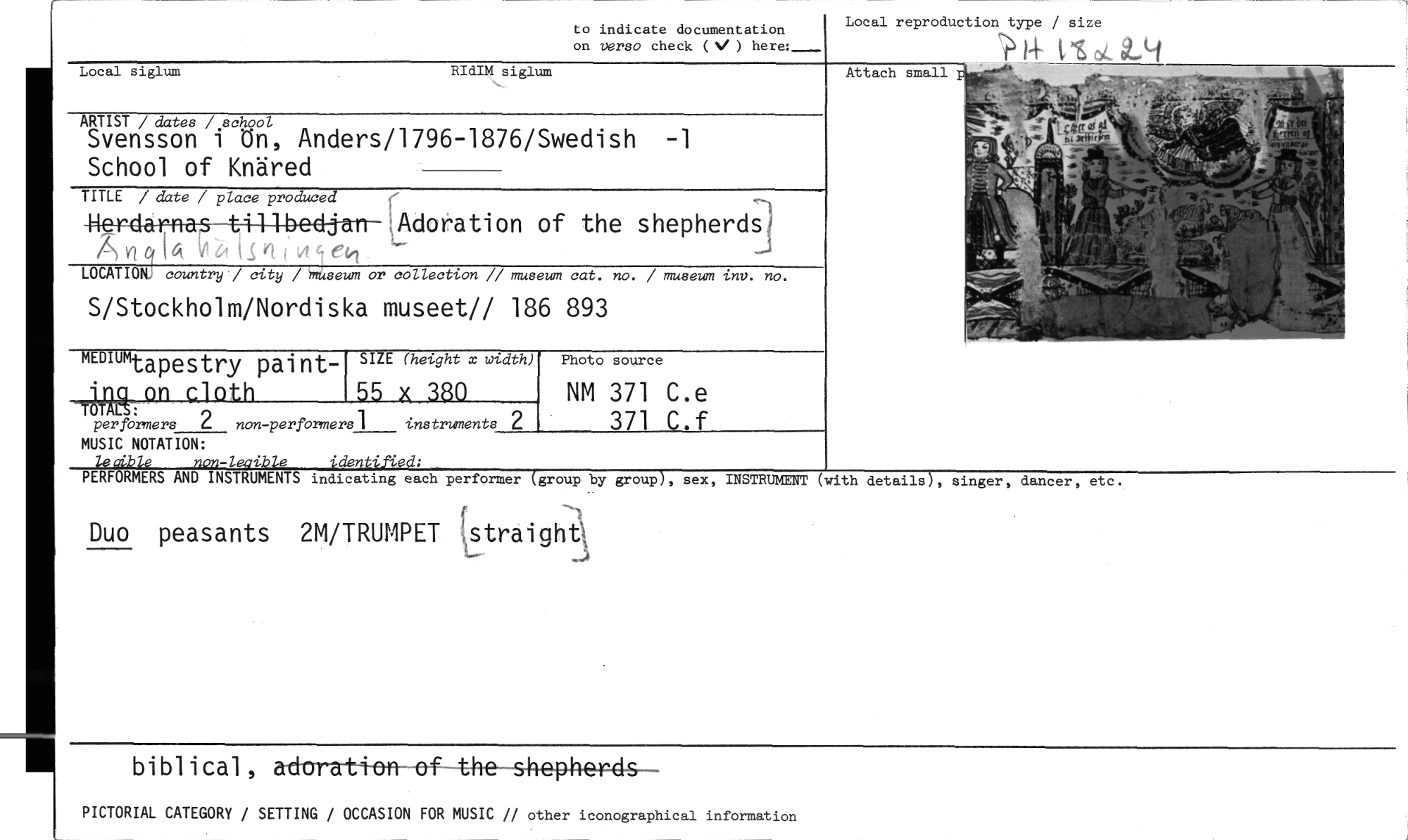 //// to indicate documentation //// on verso check (V ) here:- //// Local reproduction type / size //// 411 //// Local siglum RIdIM siglum //// ARTIST / dates / school //// i //// Svensson ön, Anders/1796-1876/Swedish -1 //// School of Knäred //// TITLE / date / place produced //// Herdiårnas-t4444ed-jan Adoration of the shepherds? //// LOCATIOW country / city / museum or collection // museum cat. no. / museum inv. no. //// S/Stockholm/Nordiska museet// 186 893 //// /-f\HYt i6 //// Attach small //// mopp- //// -Ldpestry pal nt- SIZE (hetght x xtdth) //// on cloth 55 x 380 //// per formers 2 non-performers1 instruments 2 Photo source //// NM 371 C.e 371 C.f //// MUSIC NOTATION: //// leaible non-legible identified; //// PERFORMERS AND INSTRUMENTS indicating each performer (group by //// Duo peasants 2M/TRUMPET Estraight //// group), sex, INSTRUMENT (with details), Singer, dancer, etc. //// biblical, advratte-n-*-of the shepherds //// PICTORIAL CATEGORY / SETTING / OCCASION FOR MUSIC // other iconographical information ////