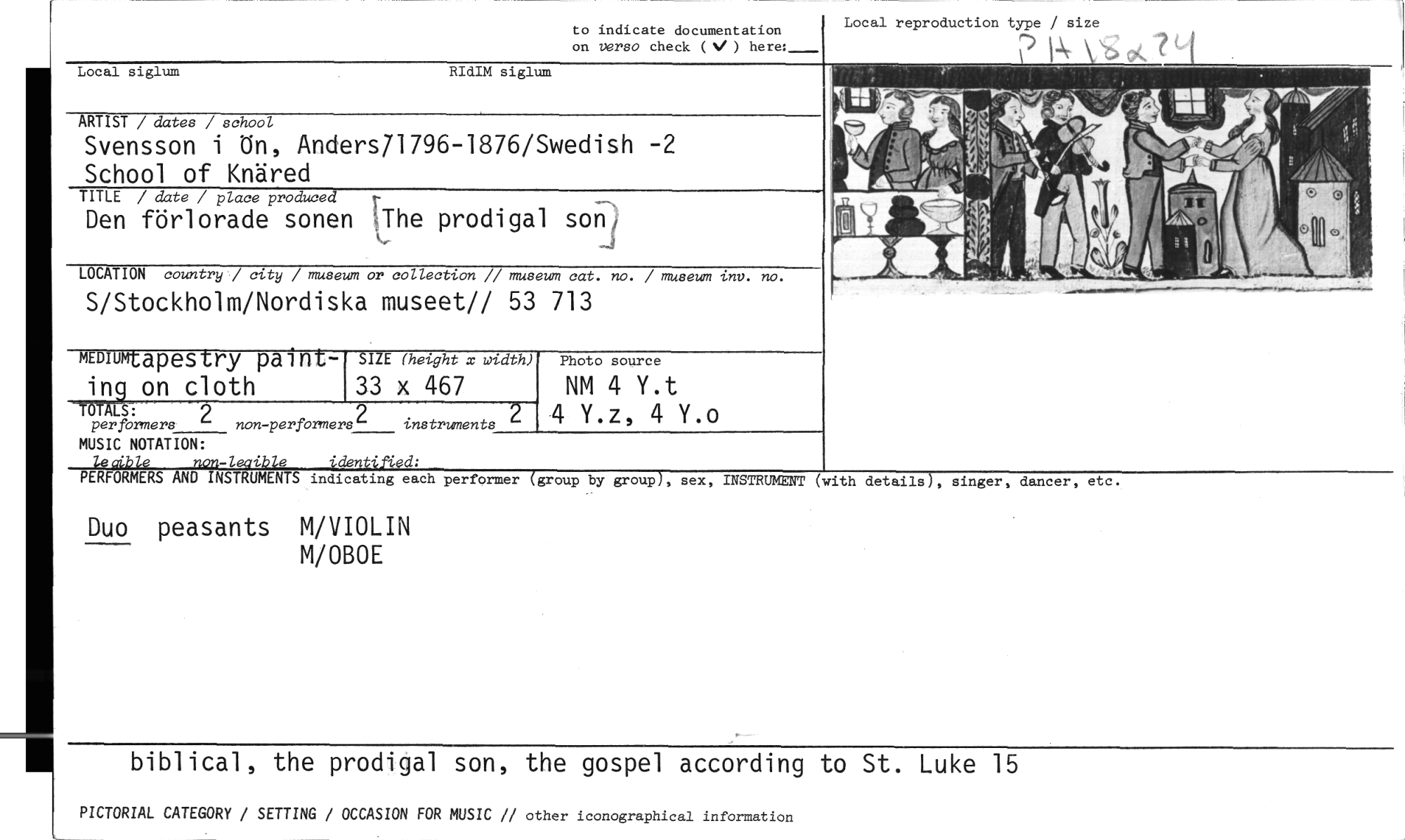 //// to indicate documentation //// on versa check ( ) here: //// Local reproduction type / size //// Local siglum RIdIM siglum //// ARTIST / dates / school //// Svensson i Ön, Anders7l796-1876/Swedish -2 School of Knäred //// TITLE / date / place produced //// Den förlorade sonen tThe prodigal son; //// j //// LOCATION country / city / museum or collection // museum cat. no. / museum inv. no. //// S/Stockholm/Nordiska museet// 53 713 //// • //// MEDI unapestry paint- SIZE (height x width) //// ing on cloth 33 x 467 //// TOTALS: 2 //// per formers 2 non-perfbrmers2 instruments Photo source //// NM 4 Y.t //// 4 Y.z, 4 Y.o //// MUSIC NOTATION: //// non-leaible identified: //// PERFORMERS AND INSTRUMENTS indicating each performer (group by group), sex, //// Duo peasants M/VIOLIN //// M/OBOE //// INSTRUMENT (with details), singer, dancer, etc. //// biblical, the prodigal son, the gospel according to St. Luke 15 //// PICTORIAL CATEGORY / SETTING / OCCASION FOR MUSIC // other iconographical information ////