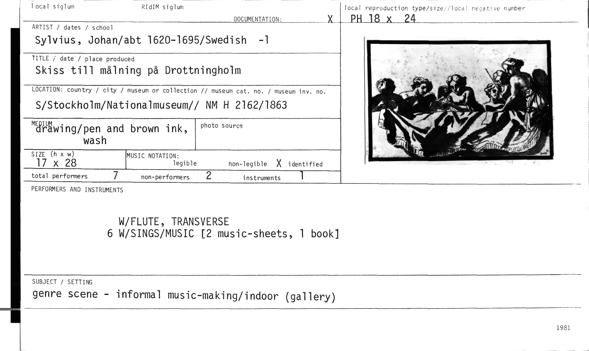 //// local siglum RIdIM siglum DOCUMENTATION: locai reproduction type/size:/loca negati4e number //// X_ PH 18 x 24 //// //// //// ARTIST / dates / school //// Sylvius, Johan/abt 1620-1695/Swedish -1 //// TITLE / date / place produced //// Skiss till målning på Drottningholm //// LOCATION: country / city / museum or collection // museum cat. no. / museum inv. no. //// S/Stockholm/Nationalmuseum// NM H 2162/1863 //// måVäwing/pen and brown ink, wash //// MUSIC NOTATION: //// legible non-legible X identified //// total performers 7 non-performers 2 instruments //// PERFORMERS AND INSTRUMENTS //// W/FLUTE, TRANSVERSE //// 6 W/SINGS/MUSIC [2 music-sheets, 1 book] //// SUBJECT / SETTING //// genre scene - informal music-making/indoor (gallery) //// 1981 ////