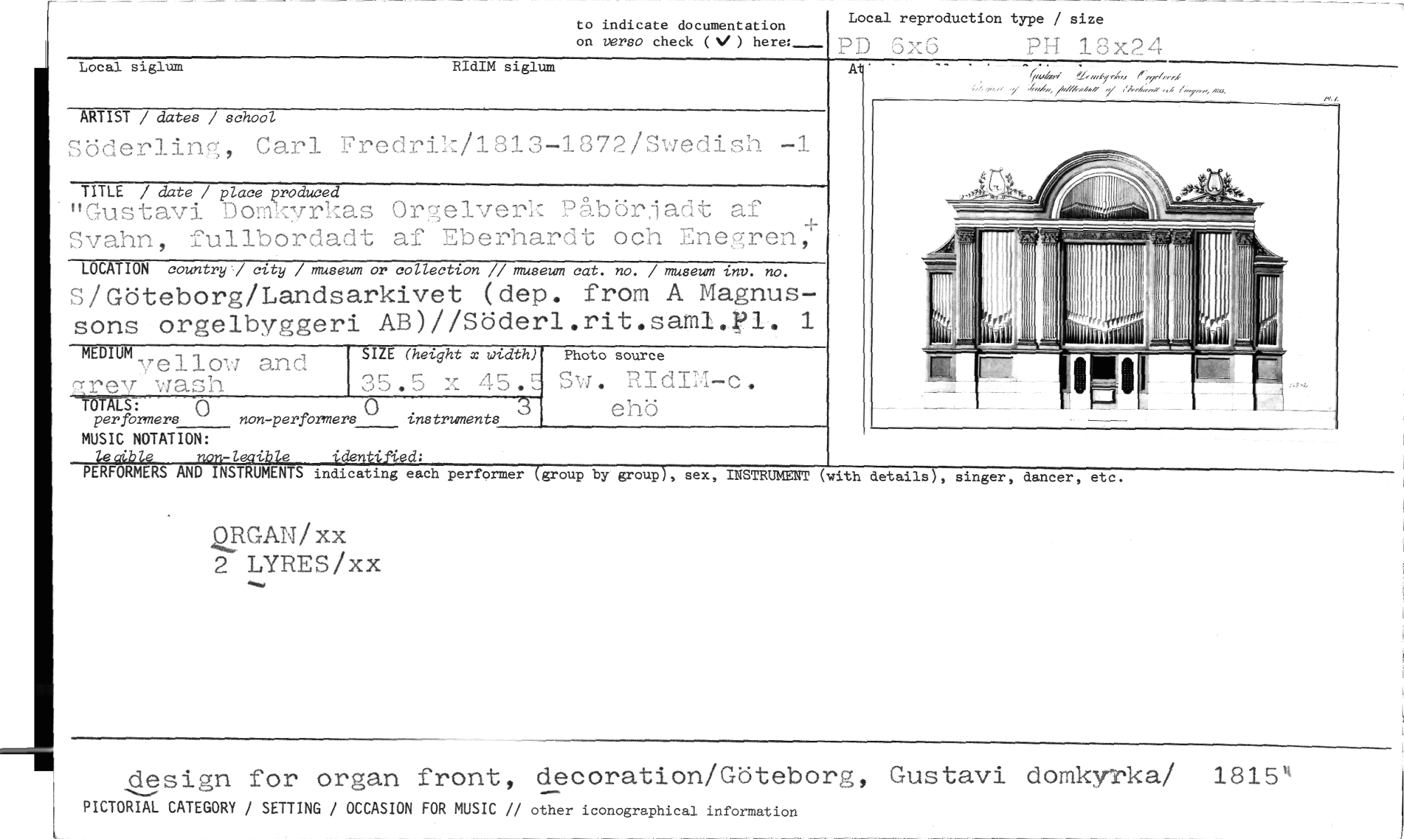 //// to indicate documentation //// on versa check (V) here:-..-- //// Local reproduction type / size //// PD 6x6 PH 18x24 //// ocal siglum RIdIM siglum //// ARTIST / dates / school //// Söderlin g, Carl Fredrik/1813-1872/Swedish -1 //// TITLE / date / place produced //// "Gustavi Domkyrkas Orgelverk Pabörjadt af Svahn, fullbordadt af Eberhardt och Enegren,± //// LOCATION country / city / museum or collection // museum cat. no. / museum inv. no. //// S/Göteborg/Landsarkivet (dep. from A Magnus- //// sons orgelbyggeri AB)//Söderl.rit.sam1.1"1. 1 //// isrev wash 35.5 x 45.E //// nmmyellow and SIZE (height m width) Sw. RIdIM-o. //// Photo source //// MALS:0 3 ehö //// per formers (1) non-performers instrzments //// A //// MUSIC NOTATION: //// non-locible identified: //// PERFORMERS AND INSTRUMENTS indicating each performer (group by group), sex, INSTRUMENT (with details), singer, dancer, etc. //// pIRGAN/xx //// 2 LYRES/xx //// design for organ front, deeoration/Göteborg, Gustavi domkyrka/ 1815' //// PICTORIAL CATEGORY / SETTING / OCCASION FOR MUSIC // other iconographical information ////