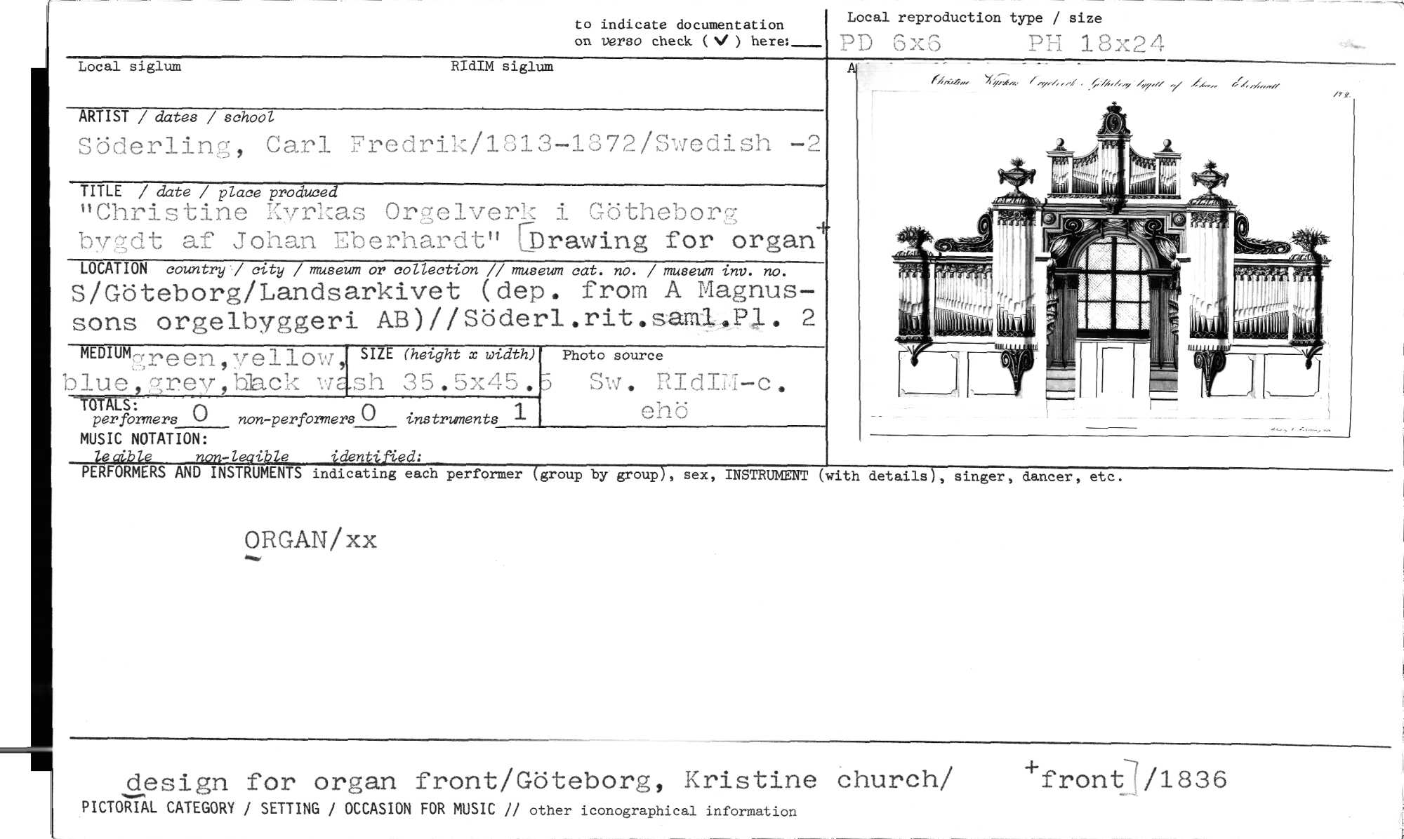 //// to indicate documentation //// on verso check (V ) here: _--- //// Local reproduction type / size //// PI) 3x6 PH 18x24 //// Local siglum RIdIM siglum //// TITLE / date / place produced //// "Christine Kyrkas Orgelverk i Götheborg bygdt af Johan Eberhardt" Cprawing for organ+ //// LOCATION country' city / museum or collection // museum cat. no. / museum inv. no. //// S/Göteborg/Landsarkivet (dep. from A Magnus- //// sons orgelbyggeri AB)//Söderl.rit.sami,P.I. 2 //// MEDIUMcr I" e e n \r SIZE (hetght x multh) //// blue,grev,Uaek wash 35.5x45. //// -TOTALS: //// per formers 0 non-performers () instruments //// MUSIC NOTATION: //// non-leaible identified: //// PERFORMERS AND INSTRUMENTS indicating each performer (group by group), sex, INSTRUMENT (with //// 1 //// Photo source //// 5 Sw. Rid' i-c. //// ehö //// ARTIST / dates / school //// Söderling, Carl Fredrik/1313-1872/Swedish -2 //// details), singer, dancer, etc. //// ORGAN/xx //// design for organ front/Göteborg, Kristine church/ //// PICTORIAL CATEGORY / SETTING / OCCASION FOR MUSIC // other iconographical information //// +front]/i836 ////