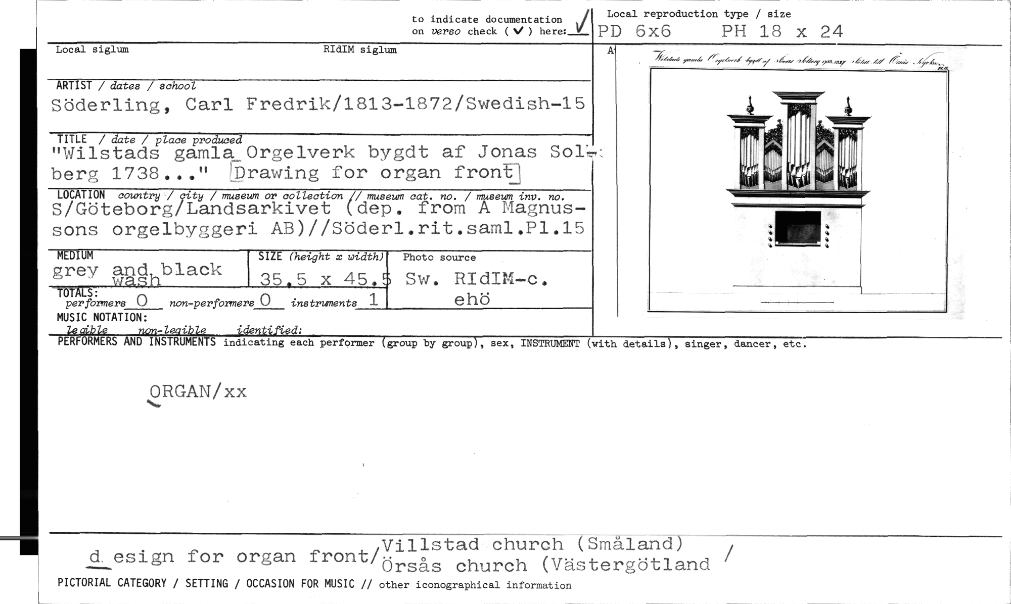 //// oto indicate documentation verso check (V ) here: //// Local reproduction type / size //// PD 6x6 PH 18 x 24 //// Local siglum RIdIM siglum A //// TITLE / date / place produce //// "Wilstads gamla Orgelverk bygdt af Jonas SoLr.: berg 1738..." 'I)rawing for organ frontl //// LOCATION country / city / museum or collection // museum cat. no. / museum inc. no. //// S/Göteborg/Landsarkivet (dep. from A Magnus- //// sons orgelbyggeri AB)//Söderl.rit.saml.P1.15 //// MEDIUM //// grey and black s, //// per formers C) non-perfOrmers 0 instruments 1 //// MUSIC NOTATION: //// non-leaible //// PERFORMERS AND INSTRUMENTS //// ARTIST / dates / school //// Söderling, Carl Fredrik/1813-1872/Swedish-15 //// SIZE (height x width) //// 35 5 x 45. //// identified: //// Photo source //// Sw. RIdIM-c. //// eho //// indicating each performer (group by group), sex, INSTRUMENT (with details), singer, dancer, etc. //// ORGAN/xx //// Villstad church (Småland) for organ front/. //// drsås church (Västergötland //// PICTOR5IALeCATJELf/ SETTING / OCCASION FOR MUSIC // other iconographical information ////