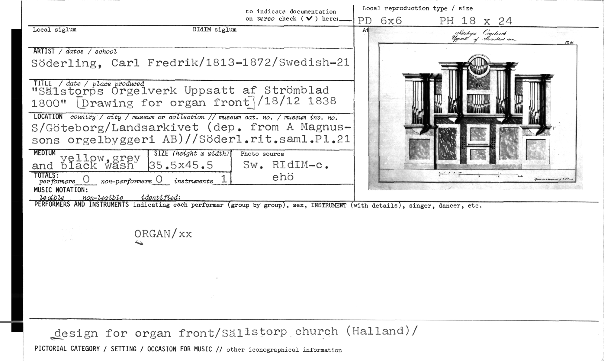 //// to indicate documentation on versa check ( ) here: //// PD 6x6 PH 18 x 24 //// Local reproduction type / size //// A //// Local siglum RIdIM siglum //// ARTIST / dates / school //// Söderling, Carl Fredrik/1813-1872/Swedish-21 //// TITLE / date / placeproduced //// Orgelverk rgelverk Uppsatt af Strömblad 1800" rprawing for organ fron-C/18/12 1838 //// LOCATION country / city / museum or collection // museum cat. no. / museum inv. no. //// S/Göteborg/Landsarkivet (dep. from A Magnus- //// sons orgelbyggeri AB)//Söderl.rit.saml.P1.21 //// MEDIUM SIZE (height x width) //// vellow,grey //// and black wäsh 35.5x45.5 //// RÅLS: //// per formers 0 non-performers 0 instruments 1 //// MUSIC NOTATION: //// 4e4ib/e non-leaible identified; //// PERFORMERS AND INSTRUMENTS //// ORGAN/xx //// Photo source //// Sw. RIdIM-c. //// ehö //// indicating each performer (group by group), sex, INSTRUMENT (with details), singer, dancer, etc. //// design for organ front/Sällstorp church (Halland)/ //// PICTORIAL CATEGORY / SETTING / OCCASION FOR MUSIC // other iconographical information ////