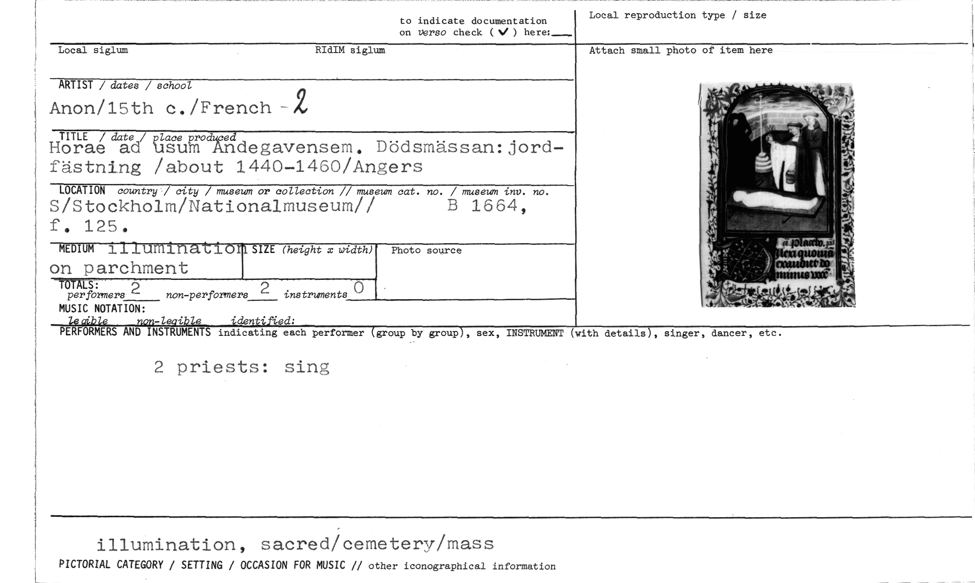 //// to indicate documentation //// on verso check ( ) here:- //// Local reproduction type / size //// Local siglum RIdIM siglum //// ARTIST / dates / school //// Anon/15th c./French -2 //// TITLE / date / place produced //// Horae ad usum Andegavensem. Dödsmässan:jordfästning /about 1440-1460/Antiers //// LOCATION country / city / museum or collection // museum cat. no. / museum inv. no. //// S/Stockholm/Nationalmuseum// B 1664, //// f. 125. //// Photo source //// MALS: //// per formers 2 non-perfOrmers 2 instruments //// MUSIC NOTATION: //// leolble non-leaible //// MEDIUM illuminationsinruightx~ on oarchment //// Attach small photo of item here //// PERFORMERS AND INSTRUMENTS indicating each performer (group by group-Y, sex, INSTRUMENT (with details), singer, dancer, etc. //// 2 priests: sing //// illumination, sacred/cemetery/mass //// PICTORIAL CATEGORY / SETTING / OCCASION FOR MUSIC 1/ other iconographical information ////