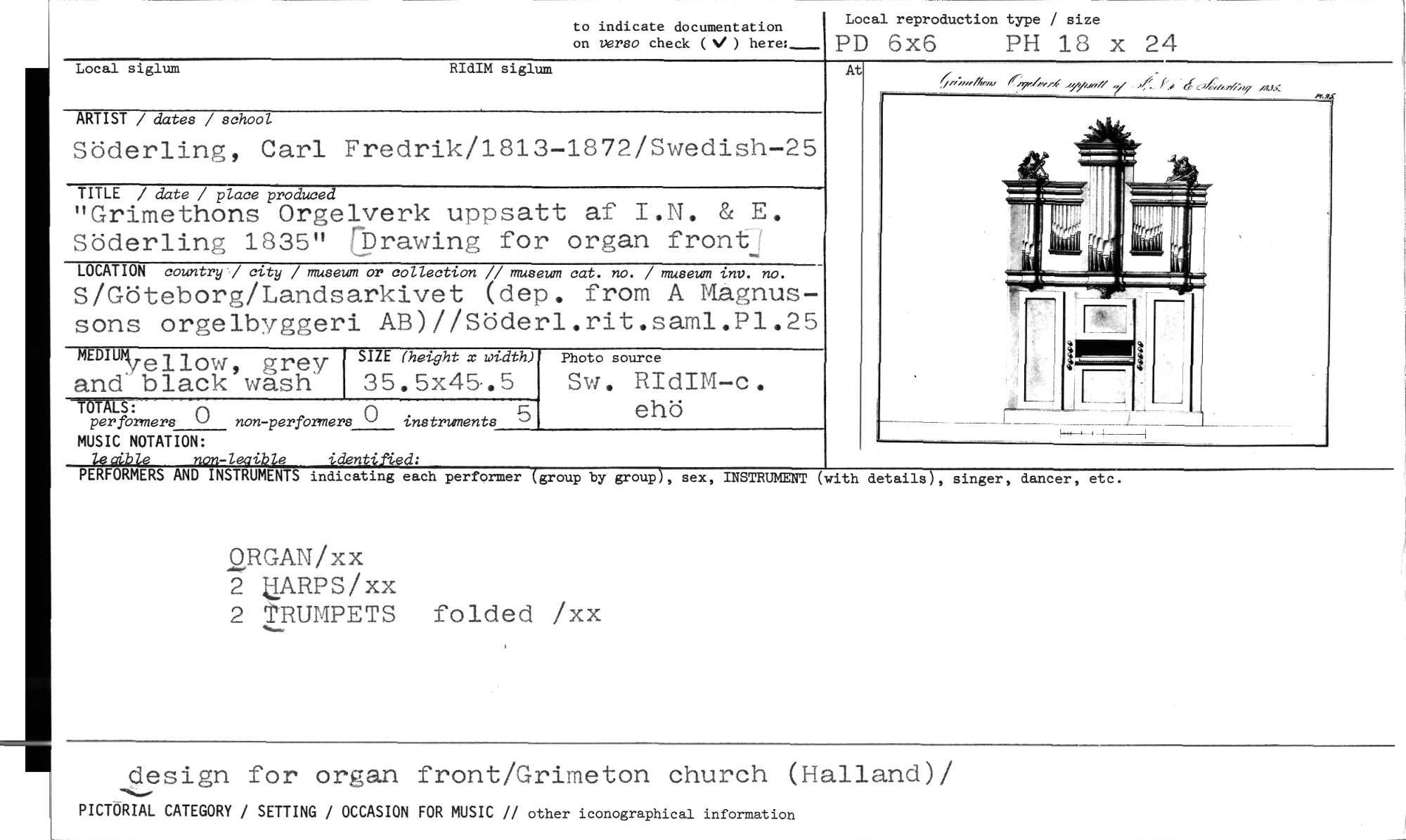 //// to indicate documentation on verso check (V) here: //// Local reproduction type / size //// PD 6x6 PH 18 x 24 //// 4., ...„0/ 4,4 y /,, //// At //// ARTIST / dates / school //// Söderling, Carl Fredrik/1813-1872/Swedish-25 //// TITLE / date / place produced //// "Grimethons Orgelverk uppsatt af I.N. & E. Söderling 1835" nDrawing for organ front( //// LOCATION country / city / museum or collection // museum cat. no. / museum inv. no. //// S/Göteborg/Landsarkivet (dep. from A Magnus- //// sons orgelbyggeri AB)//Söderl.rit.saml.P1.25 //// moinm //// -yellow, grer SIZE (height x width) //// and' black wash 35.5x45.5 //// -TÖTALS: //// per formers () non-perfbrmers ° instruments //// MUSIC NOTATION: //// le oible non-leaible identified: //// PERFORMERS AND INSTRUMENTS indicating each //// ORGAN/xx //// 2 UARPS/xx //// 2 TRUMPETS folded /xx //// Local siglum RIdIM siglum //// Photo source //// Sw. RIdIM-c. //// ehö //// performer (group by group), sex, INSTRUMENT with details), singer, dancer, etc. //// design for organ front/Grimeton church (Halland)/ //// PICTORIAL CATEGORY / SETTING / OCCASION FOR MUSIC // other iconographical information ////