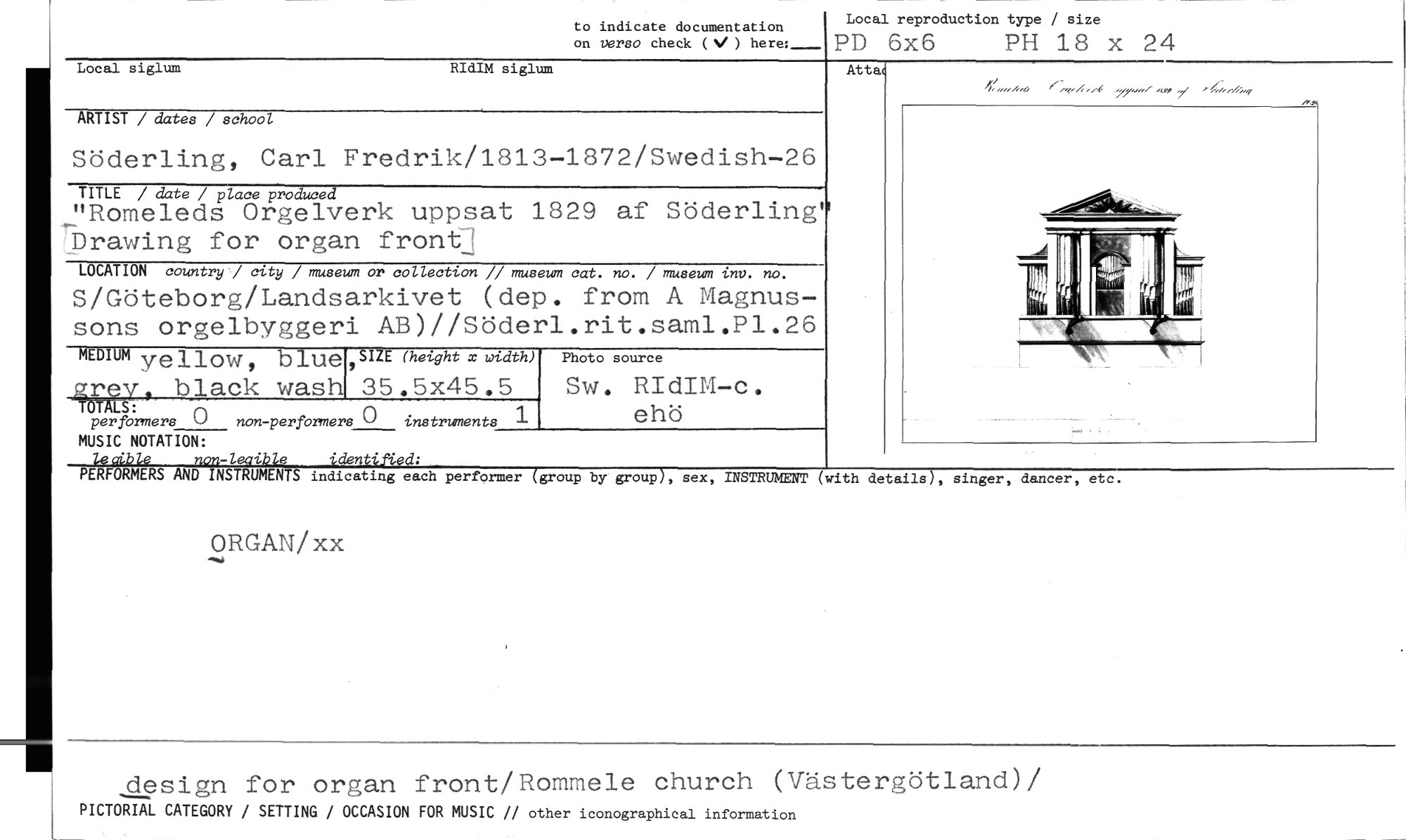 //// to indicate documentation //// on verso check (V ) here:_ //// Local reproduction type / size //// PD 6x6 PH 18 x 24 //// Local siglum RIdIM siglum //// ARTIST / dates / school //// Söderling, Carl Fredrik/1813-1872/Swedish-26 //// TITLE / date / place produced //// "Romeleds Orgelverk uppsat 1829 af Söderling" Drawing for organ frontl //// LOCATION country city / museum or collection /j museum cat. no. / museum inv. no. //// S/Göteborg/Landsarkivet (dep. from A Magnus- //// sons orgelbyggeri AB)//Söderl.rit.saml.Pl.26 //// MEDIUM yellow, blue YSIZE (height x width) //// grey. black wash 35.5x45.5 //// TOTALS: //// per formers () non-perfbrmers 0 instruments //// MUSIC NOTATION: //// 4eaible non-leaible identifisd: //// PERFORMERS AND INSTRUMENTS indicating each //// Photo source //// Sw. RIdIM-c. //// ehö //// Åtta( //// performer (group by group), sex, INSTRUMENT (with details), singer, dancer, etc. //// ORGAN/xx //// design for organ front/Rommele church (Västergötland)/ //// PICTORIAL CATEGORY / SETTING / OCCASION FOR MUSIC // other iconographical information ////