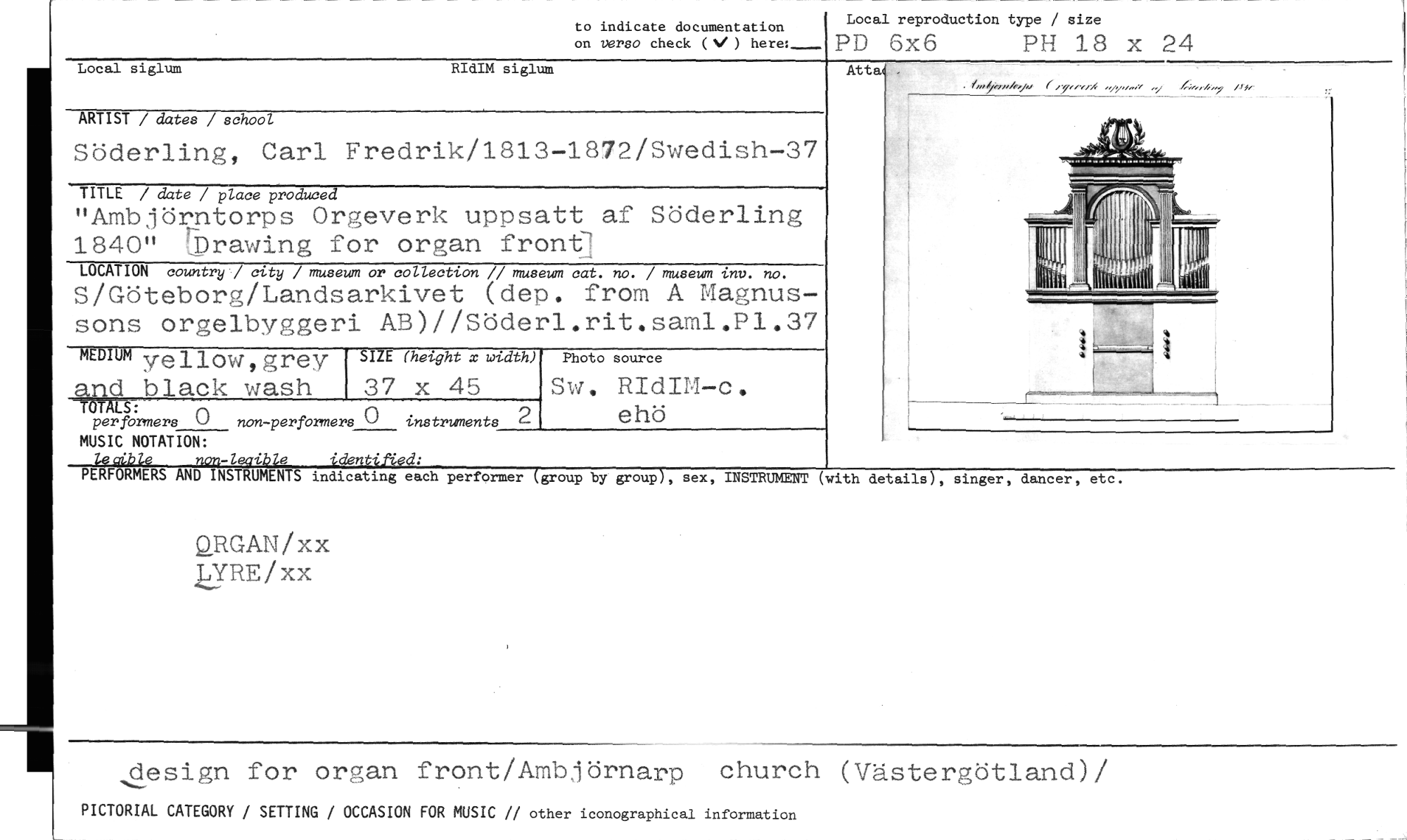 //// to indicate documentation //// on versa check (V) here:_ //// Local reproduction type / size //// PD 6x6 PH 18 x 24 //// Local siglum RIdIM siglum //// ARTIST / dates / school //// Söderling, Carl Fredrik/1813-1872/Swedish-37 //// TITLE / date / place produced //// "Ambjörntorps Orgeverk uppsatt af Söderling 1840" rbrawing for organ front7 //// LOCATION country / city / museum or collection // museum cat. no. / museum tno. no. //// S/Göteborg/Landsarkivet (dep. from A Magnus- //// sons orgelbyggeri AB)//Söderl.rit.saml.P1.37 //// Photo source //// Sw. RIdIM-c. //// ehö //// aRGAN/xx //// YRE/xx //// MEDIUM yellow,grev //// SIZE (height x width) //// 4R6 plack wash 37 x 45 //// LS: //// per formers C) non-performers () instruments //// MUSIC NOTATION: //// iernble non-leoible identified; //// PERFORMERS AND INSTRUMENTS indicating each performer (group by group), //// 2 //// At-ta //// sex, INSTRUMENT (with details), singer, dancer, etc. //// design for organ front/Ambjörnarp church (Västergötland)/ //// ^_ //// PICTORIAL CATEGORY / SETTING / OCCASION FOR MUSIC // other iconographical information ////