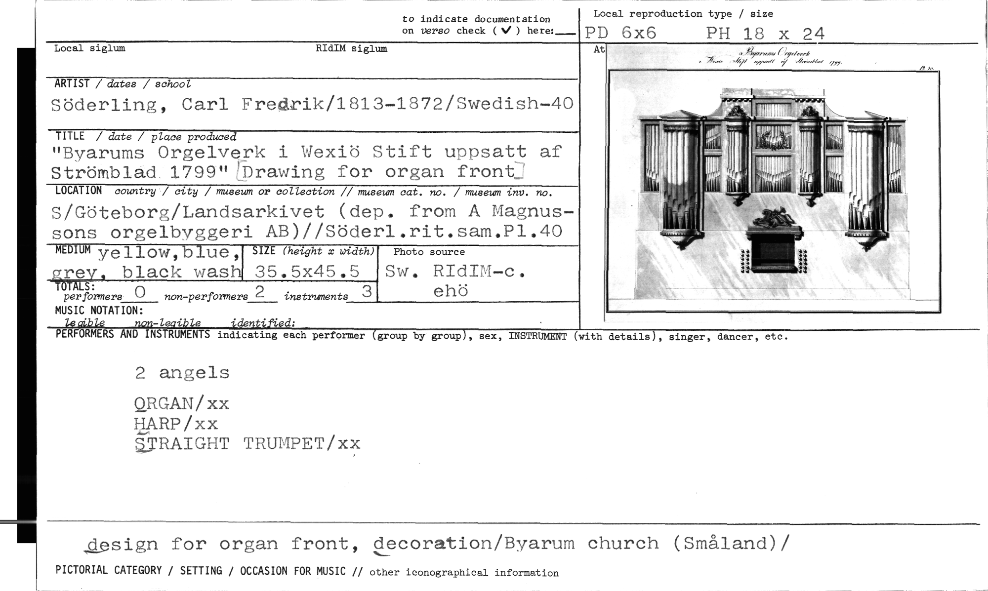 //// to indicate documentation //// on verso check (V ) hem_ //// Local reproduction type / size //// PD 6x6 PH 18 x 24 //// At //// details), singer, dancer, etc. //// ARTIST / dates / school //// Söderling, Carl Fredrik/1813-1372/Swedish-40 //// TITLE / date / place produced //// "Byarums Orgelverk i Wexiö Stift uppsatt af Strömbläd 1799"Drawing for organ front-7 //// LOCATION country / city / museum or collection // museum cat. no. / museum inv. no. //// S/Göteborg/Landsarkivet (dep. from A Magnussons orgelbyggeri AB)//Söderl.rit.sam.P1.40 //// mommvellow,blue, SIZE (height x width) Photo source //// f-,rev. black wash 35.5x45.5 Sw. RIdIM-c. //// ÖTALS: //// per formers non-perfbrmers 2 instruments ehö //// MUSIC NOTATION: //// leaible non-lecible identified: //// PERFORMERS AND INSTRUMENTS indicating each performer (group by group), //// 2 angels //// QRGAN/xx //// UARP/xx //// j'RAIGHT TRUMPET/xx //// sex, INSTRUMENT (with //// Local siglum RIdIM siglum //// design for organ front, decoration/Byarum church (Småland)/ //// PICTORIAL CATEGORY / SETTING / OCCASION FOR MUSIC // other iconographical information ////