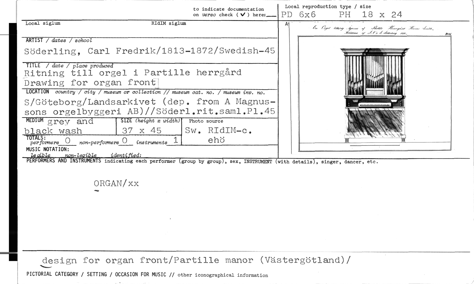 //// to indicate documentation //// on verso check (V ) here:- //// Local reproduction type / size //// PD 6x6 PH 18 x 24 //// Local siglum RIdIM siglum //// ARTIST / dates / school //// Söderling, Carl Fredrik/1813-1872/Swedish-45 //// TITLE / date / place produced //// Ritning till orgel i Partille herrgård Drawing for organ front? //// LOCATION country / city / museum or collection // museum cat. no. / museum lnv. no. //// S/Göteborg/Landsarkivet (dep. from A Magnus- //// sons orgelbyggeri AB)//Söderl.rit.saml.Pl.45 //// MEDIUM grey and SIZE (height x width) Photo source //// black wash 37 x 45 Sw. RIdIM -c. //// TETALS : //// per formers C) non-perfbrmers 0 instruments ehö //// MUSIC NOTATION: //// lecible non-leaible identified: //// PERFORMERS AND INSTRUMENTS indicating each performer //// A //// //// (group by group), sex, INSTRUMENT (with details), singer, dancer, etc. //// ORGAN/xx //// design for organ front/Partille manor (Västergötland)/ //// PICTORIAL CATEGORY / SETTING / OCCASION FOR MUSIC // other iconographical information ////