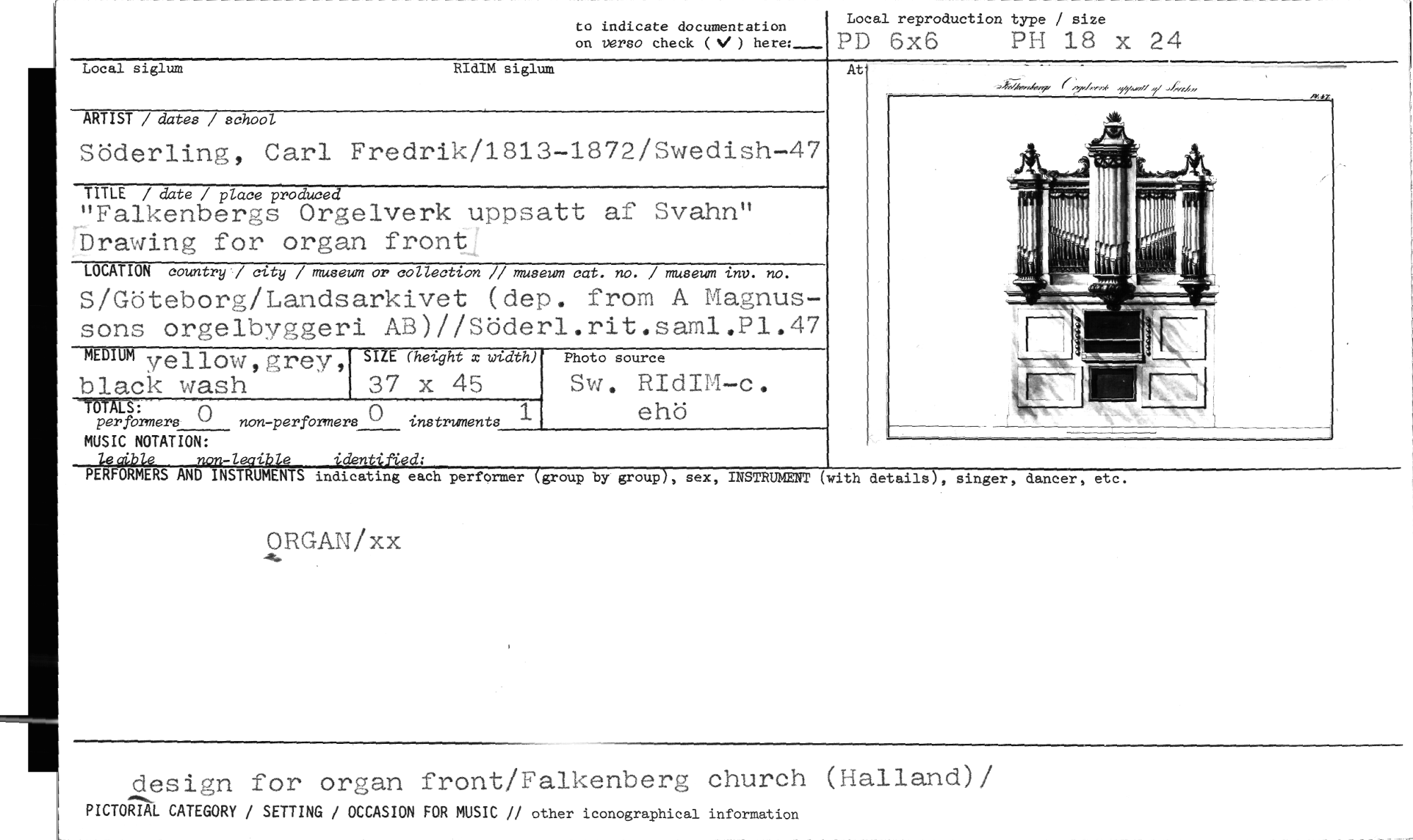 //// to indicate documentation //// on verso check ( ) here:_... //// Local reproduction type / size //// PD 6x6 PH 18 x 24 //// At //// performer (group by group), sex, INSTRUMENT (with //// Local siglum RIdIM siglum //// ARTIST / dates / school //// Söderling, Carl Fredrik/1813-1872/Swedish-47 //// TITLE / date / place produced //// "Falkenbergs Orgelverk uppsatt af Svahn" Drawing for organ front.' //// LOCATION country] city / museum or collection // museum cat. no. / museum tnv. no. //// S/Göteborg/Landsarkivet (dep. from A Magnus- //// sons orgelbyggeri AB)//Söderl.rit.saml.P1.47 //// MEDIUM yellow,grey, SIZE (height x width) Photo source //// black wash 37 x 45 Sw. RIdIM -c. //// ms---: //// 0 ehö //// perfbrmerm non-performers instruments //// MUSIC NOTATION: //// kw, le noo-legiple identified; //// PERFO' ERS AND INSTRUMENTS indicating each //// details), singer, dancer, etc. //// ORGAN/xx //// design for organ front/Falkenberg church (Halland)/ //// PICTORIAL CATEGORY / SETTING / OCCASION FOR MUSIC // other iconographical information ////