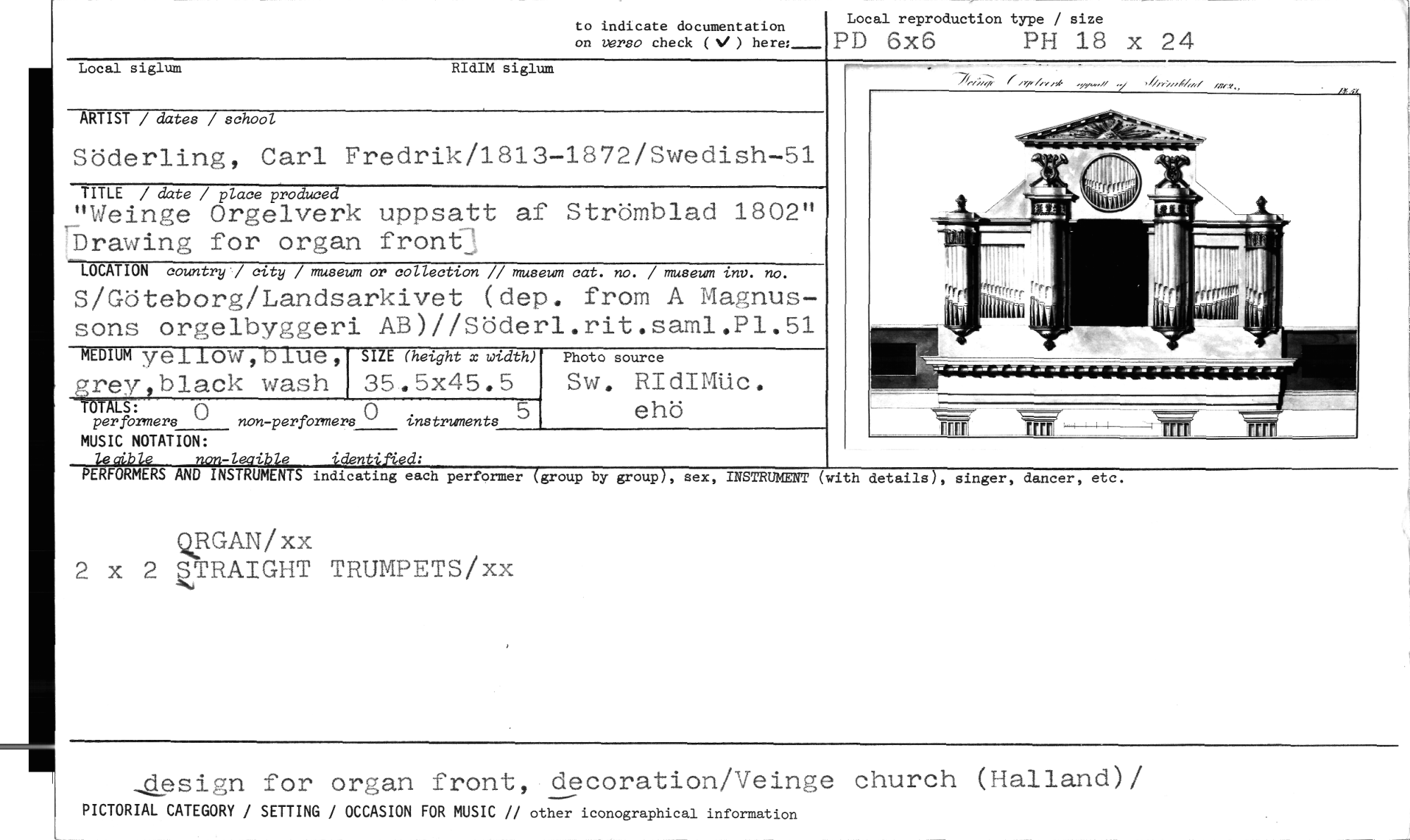 //// to indicate documentation //// on versa check ( here: __-- //// Local reproduction type / size //// PD 6x6 PH 18 x 24 //// Local siglum RIdIM siglum //// ARTIST / dates / school //// Söderling, Carl Fredrik/1813-1872/Swedish-51 //// TITLE / date / place produced //// "Weinge Orgelverk uppsatt af Strömblad 1802" iDrawing for organ front //// LOCATION country / city / museum or collection // museum cat. no. / museum inv. no. //// S/Göteborg/Landsarkivet (dep. from A Magnus- //// sons orgelbyggeri AB)//Söderl.rit.saml.P1.51 //// mummyellow,olue, sin(heightx width) Photo source //// grey,black wash 35.5x45.5 Sw. RIdIMUc. //// TOTALS: 0 0• ehö //// performere non-perPrmers tnstruments //// MUSIC NOTATION: //// ignale non-leaible identified: //// PERFORMERS AND INSTRUMENTS indicating each performer (group by group), sex, INSTRUMENT (with //// details), singer, dancer, etc. //// VGAN/xx //// x 2 ZTRAIGHT TRUMPETS/xx //// design for organ front, decoration/Veinge church (Halland)/ //// PICTORIAL CATEGORY / SETTING / OCCASION FOR MUSIC // other iconographical information ////