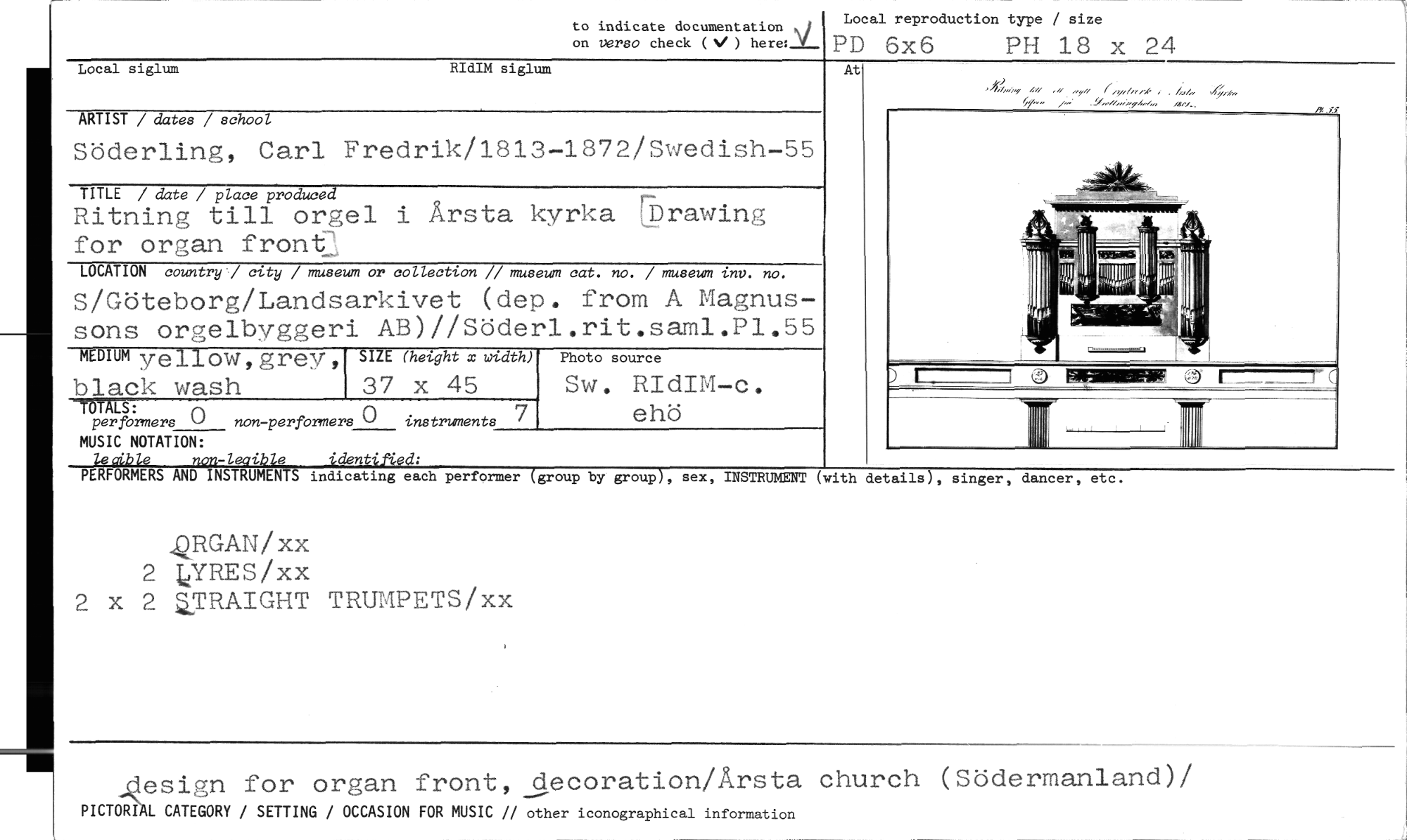 //// to indicate documentation //// on verso check (4/ ) here: _t_ //// Local reproduction type / size //// PD 6x6 PH 18 x 24 //// At //// -. 04, //// jji j, "73' MINN' pi., ;:li..,I, ,Ifr:::: ,siz:. I j - //// ARTIST / dates / school //// Söderling, Carl Fredrik/1813-1872/Swedish-55 //// TITLE / date / place produced //// Ritning till orgel i Årsta kyrka [brawing for organ front //// LOCATION country / city / museum or collection // museum cat. no. / museum inv. no. //// S/Göteborg/Landsarkivet (dep. from A Magnus- //// sons orgelbyggeri AB)//Söderl.rit.saml.Pl.55 //// MEDIUM yellow,grey, SIZE (height x width) Photo source //// black wash 37 x 45 Sw. RIdIM-c. //// TOTALS: instruments eho //// per formers C) non-perfermers C) //// MUSIC NOTATION: //// Local siglum RIdIM siglum //// levible non-leaible identified: //// PERFORMERS AND INSTRUMENTS indicating each performer (group by group), sex, //// INSTRUMENT (with details), singer, dancer, etc. //// AhRGAN/xx 2 VRES/xx //// 2 x 2 ZTRAIGHT TRUMPETS/xx //// ...Qesign for organ front, decoration/Årsta church (Södermanland)/ //// PICTORfAL CATEGORY / SETTING / OCCASION FOR MUSIC // other iconographical information ////