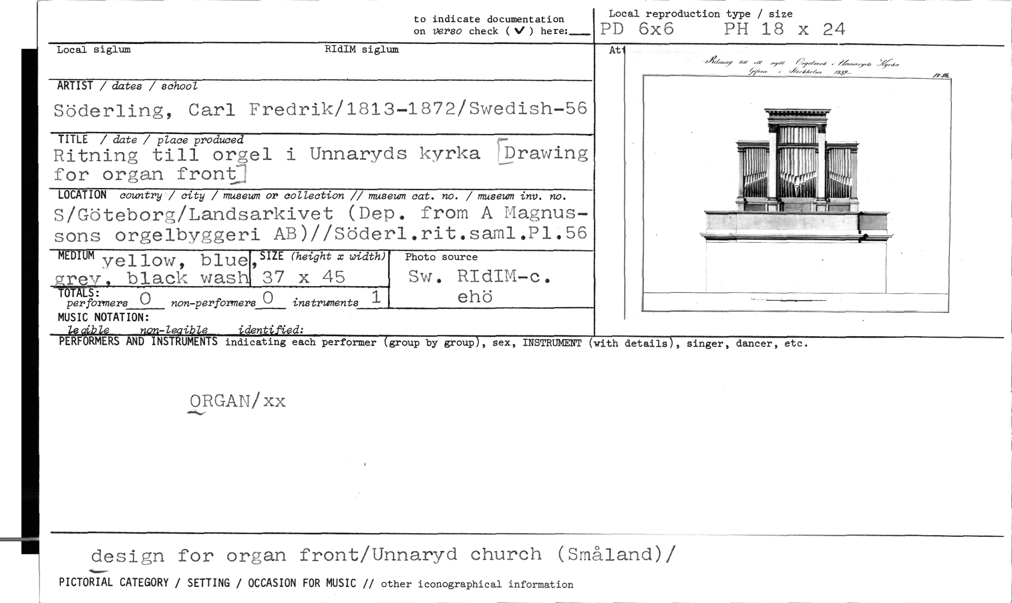 //// to indicate documentation //// on verso check (V ) here: //// Local reproduction type / size //// PD 6x6 PH 18 x 24 //// ARTIST / dates / school //// Söderling, Carl Fredrik/1813-1872/Swedish-56 //// TITLE / date / place produced //// Ritning till orgel i Unnaryds kyrka flbrawing for organ front //// LOCATION country / city / museum or collection // museum cat. no. / museum inv. no. //// S/Göteborg/Landsarkivet (Dep. from A Magnus- //// sons orgelbyggeri AB)//Söderl.rit.saml.P1.56 //// MEDIUM yellow, blue //// Brev. black wash OTALS: per formers 0 non-performers 0 instruments //// MUSIC NOTATION: //// legkble non-leaible identified: //// PERFORMERS AND INSTRUMENTS indicating each performer (group by group), //// ORGAN/xx //// //// 111111°1 //// 011 4 141 //// 4.j ji //// _ V... //// //// SIZE (height x width) //// 37 x 45 //// Photo source //// Sw. RIdIM-c. //// eho //// sex, INSTRUMENT (with details), singer, dancer, etc. //// t //// Local siglum RIdIM siglum //// design for organ front/Unnaryd church (Småland)/ //// PICTORIAL CATEGORY / SETTING / OCCASION FOR MUSIC // other iconographical information ////