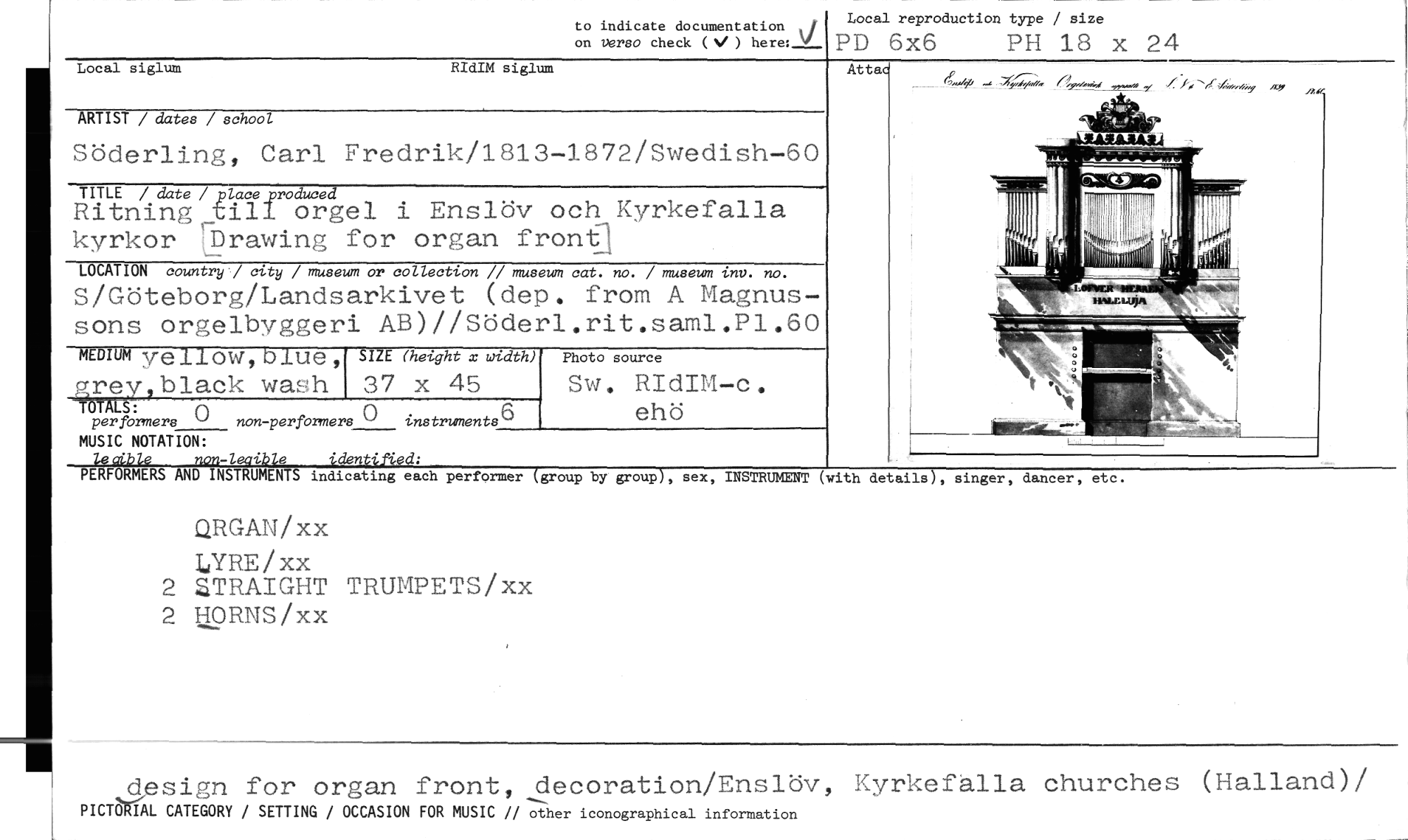 //// to indicate documentation on verso check (V ) here: //// Local reproduction type / size //// PD 6x6 PH 18 x 24 //// Local siglum RIdIM siglum //// ARTIST / dates / school //// Söderling, Carl Fredrik/1813-1872/Swedish-60 //// TITLE / date / place till Ritning till orgel i Enslöv och Kyrkefalla kyrkor Uprawing for organ front] //// LOCATION country./ city / museum or collection // museum cat. no. / museum inv. no. //// S/Göteborg/Landsarkivet (dep. from A Magnus- //// sons orgelbyggeri AB)//Söderl.rit.saml.Pl.60 //// MEDIUM yellow, blue, grey,black wash SIZE (height x width) Photo source //// 37 x 45 Sw. RIdIM-c. //// eho //// -TöTALg: fl instruments //// performere (3 non-performers //// MUSIC NOTATION: //// PERFORMERS AND INSTRUMENTS indicating each performer //// l cible non-lecible identtäyd: //// QRGAN/xx //// WRE/xx //// 2 ZTRAIGHT TRUMPETS/xx //// 2 HORNS/xx //// At tac //// (group by group), sex, INSTRUMENT (with details), singer, dancer, etc. //// design for organ front, decoration/Enslöv, Kyrkefalla churches (Halland)/ //// PICEPRIAL CATEGORY / SETTING / OCCASION FOR MUSIC // other iconographical information ////