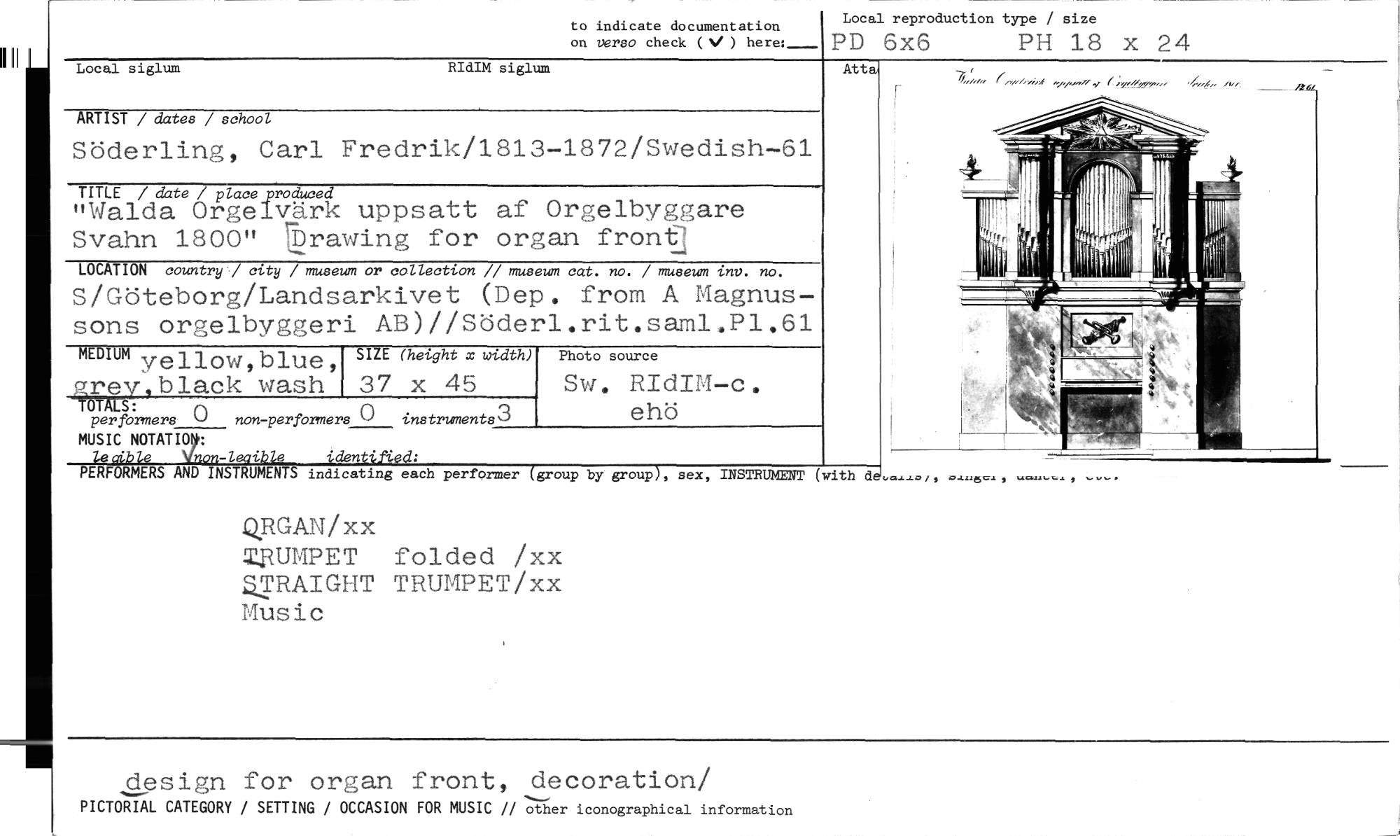 //// to indicate documentation Local reproduction type / size //// on versa check (V) here: PD 6x6 PH 18 x 24 //// Local siglum RIdIM siglum //// ARTIST / dates / school //// Söderling, Carl Fredrik/1813-1872/Swedish-61 Svahn 1800" Drawing for organ front //// "Walda Orgelvärk uppsatt af Orgelbyggare //// TITLE / date / placeprodUced //// LOCATION country / city / museum or collection // museum cat. no. / museum inv. no. //// S/Göteborg/Lands arkivet (Dep. from A Magnus- //// sons orgelbygger i AB)//Söderl.rit.saml.P1.61 //// MEDIUM yellow,blue, 7rey.black wash SIZE (height x width) Photo source //// 37 x 45 Star. RIdIM -e. //// ehö //// "rtTA-13: instruments 3 //// per formers 0 non-perforrners 0 //// MUSIC NOTATIOO: _Lecible Vnon-leaible identified: //// PERFORMERS AND INSTRUMENTS indicating each performer //// QRGAN/xx //// ZgUMPET folded /xx ZTRAIGHT TRUMPET/xx Music //// Atta //// group by group , sex, INSTRUMENT (with de //// design for organ front, decoration/ //// PICTORIAL CATEGORY / SETTING / OCCASION FOR MUSIC // other iconographical information ////