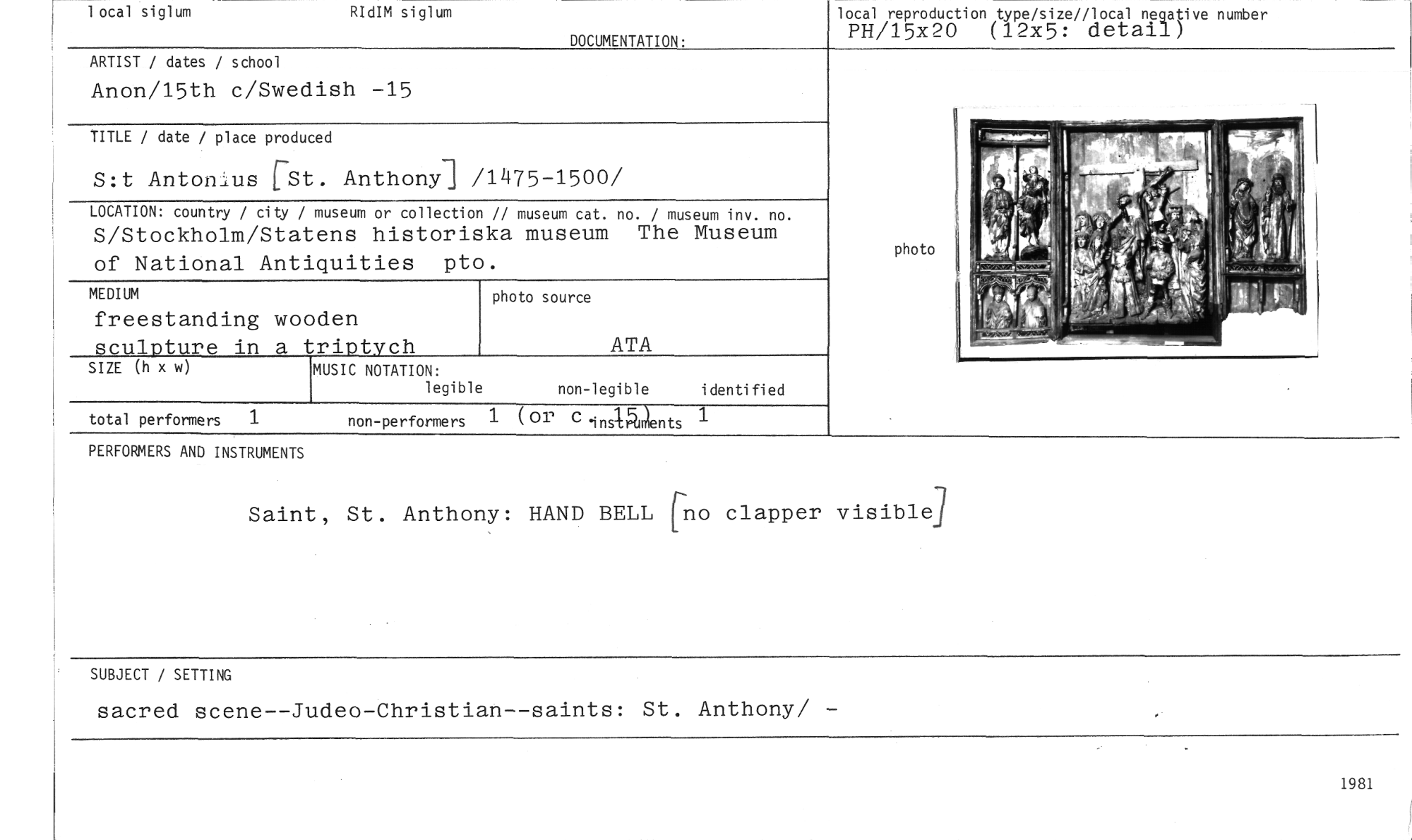 //// 1 ocal siglum RIdIM siglum //// DOCUMENTATION• //// local reproduction type/size//local negative nurober //// PH/15x20 (12x5: detail) //// ARTIST / dates / school //// Anon/15th c/Swedish —15 //// TITLE / date / place produced //// S:t Antonius råt. Anthony] /1475-1500/ //// LOCATION: country / city / museum or collection // museum cat. no. / museum inv. no. //// S/Stockholm/Statens historiska museum The Museum of National Antiquities pto. //// MEDIUM photo source //// freestanding wooden //// sculnture in a trintych ATA //// SIZE (h x w) MUSIC NOTATION: //// legible non-legible i denti fi ed //// total performers 1 non-performers 1 (or C instUnts 1 //// PERFORMERS AND INSTRUMENTS //// photo //// Saint, St. Anthony: HAND BELL [no clapper visiblei //// SUBJECT / SETTING //// sacred scene--Judeo-Christian--saints: St. Anthony/ - //// 1981 ////