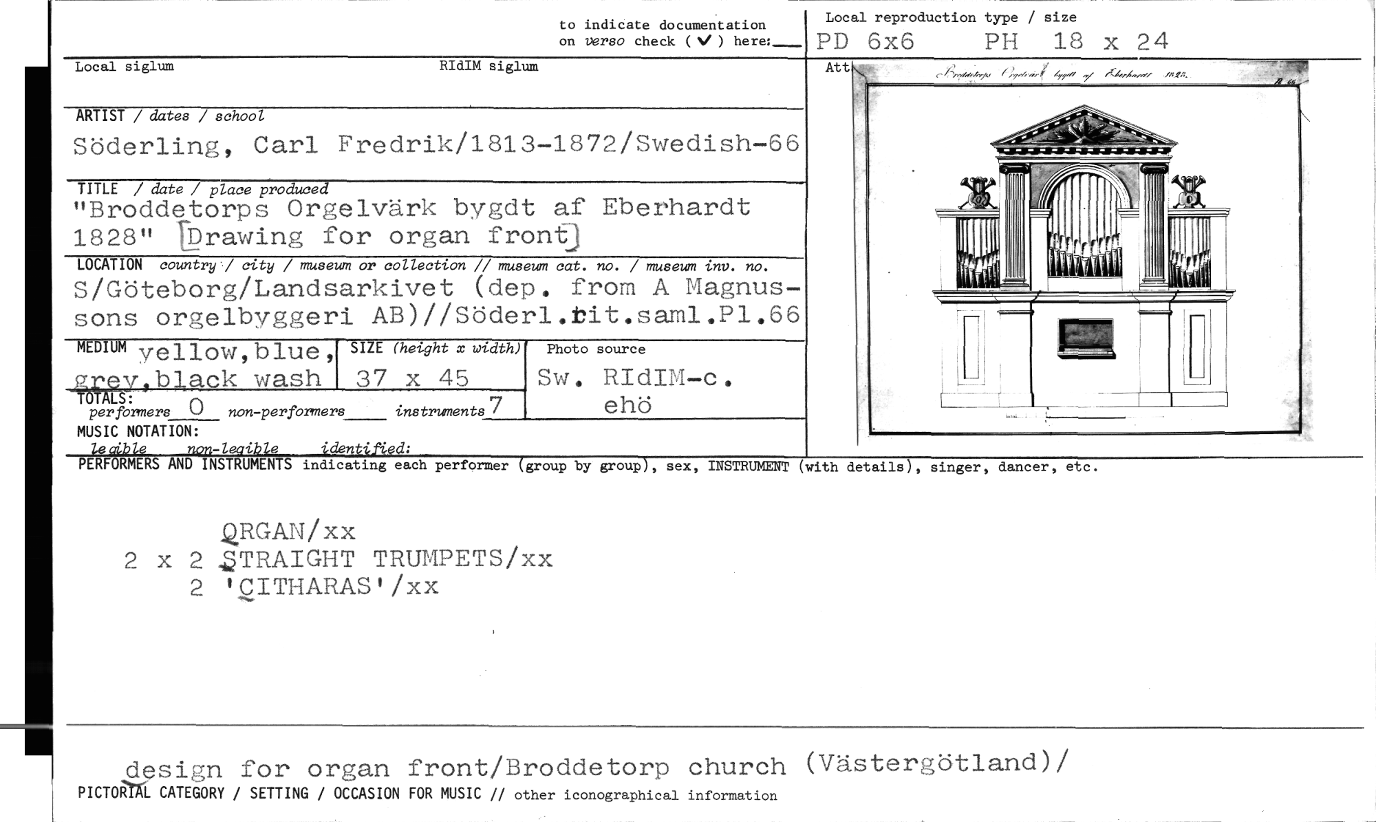 //// to indicate documentation Local reproduction type / size //// on verso check (V) here: PD 6x6 PH 18 x 24 //// Local siglum RIdIM siglum //// ARTIST / dates / school //// Söderling, Carl Fredrik/1813-1872/Swedish-66 //// TITLE / date / place produced //// "Broddetorps Orgelvärk bygdt af Eberhardt 1828" brawing for organ front) //// LOCATION country / city / museum or collection // museum cat. no. / museum inv. no. //// S/Göteborg/Landsarkivet (dep. from A Magnus- //// sons orgelbyggeri AB)//Söderl.bit.saml.Pl.66 //// MEDIUM vellow,blue SIZE (hetght x width) Photo source //// wash 37 x 45 Sw. RIdIM-c. //// _uripvtblack ehö //// TOT LS: instruments7 //// per formers 0 non-perforners //// MUSIC NOTATION: //// 194g1/4 -leaibie identified: //// PERFORMERS AND INSTRUMENTS indicating each performer (-group by group), sex, //// singer, dancer, etc. //// INSTRUMENT (with details), //// QRGAN/xx //// 2 x 2 QTRAIGHT TRUMPETS/xx 2 'CITHARAS'/xx //// design for organ front/Broddetorp church (västerp;ötiand)/ //// PICTONL CATEGORY / SETTING / OCCASION FOR MUSIC // other iconographical information ////