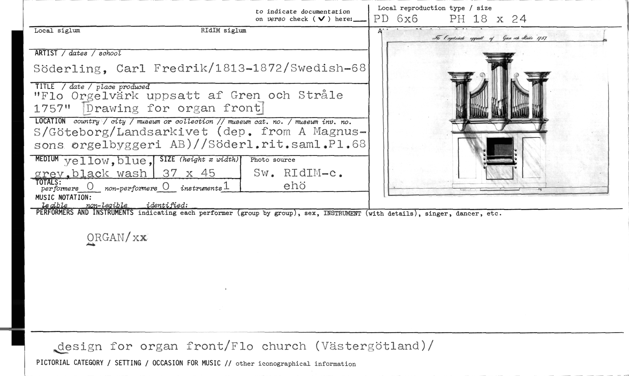 //// to indicate documentation //// Local reproduction type / size //// on versa check (N/ ) here:_ PD 6x6 PH 18 x 24 //// Local siglum RIdIM siglum //// ARTIST / dates / school //// Söderling, Carl Fredrik/1813-1872/Swedish-68 //// TITLE / date / place produced //// "Flo Orgelvärk uppsatt af Gren och Stråle 1757" Tbrawing for organ front] //// LOCATION country / city / museum or collection // museum cat. no. / museum inv. no. //// S/Göteborg/Landsarkivet (dep. from A Magnus- //// sons orgelbyggeri AB)//Söderl.rit.saml.P1.68 //// MEDIUM yellow,blue, SIZE (height x width) Photo source //// rev.black wash 37 x 45 Sw. RIdIg-c. //// per formers O non-performers 0 instruments eho //// MUSIC NOTATION: //// leaible non-leaible identified: //// PERFORMERS AND INSTRUMENTS indicating each performer (group by group), sex, INSTRUMENT (with details), singer, dancer, etc. //// ORGAN/xx //// design for organ front/Flo church (Västergötland)/ //// PICTORIAL CATEGORY / SETTING / OCCASION FOR MUSIC // other iconographical information ////