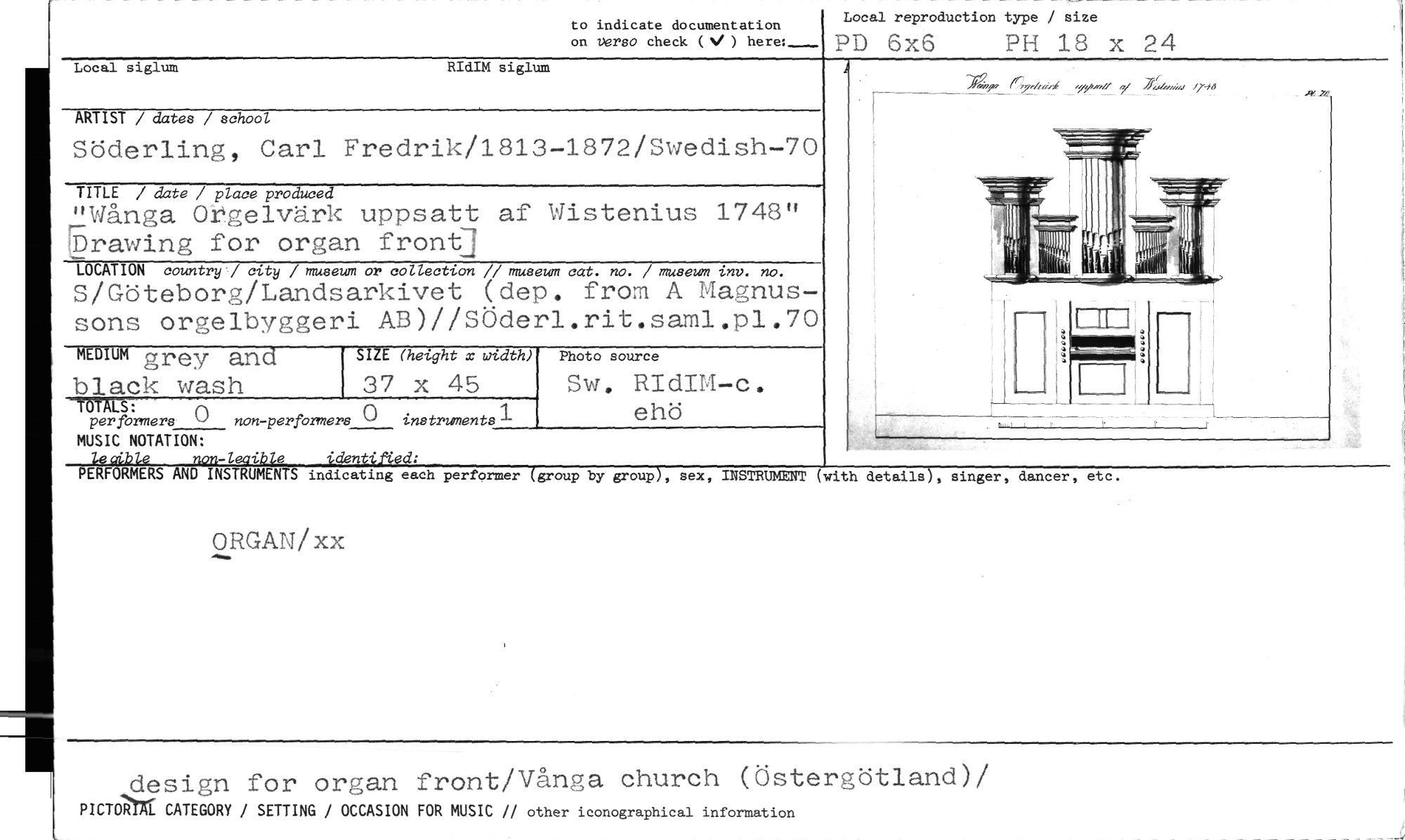 //// to indicate documentation //// on verso check (N/ ) here:_ //// Local reproduction typs / size //// PD 6x6 PH 18 x 24 //// Wrozp eh 2;.;:e _we /7 å //// ARTIST / dates / school //// Söderling, Carl Fredrik/1813-1872/Swedish-70 //// TITLE / date / place produced //// "Wånga Orgelvärk uppsatt af Wistenius 1748" 5rawing for organ front] //// LOCATION country '/ city / museum or collection // museum cat. no. / museum inv. no. //// S/Göteborg/Landsarkivet (dep. from A Magnus- //// sons orgelbyggeri AB)//SÖderl.rit.saml.p1.70 //// MEDIUM grey and SIZE (helght x width) Photo aource //// black wash 37 x 45 Sw. RIdIM-c. //// ehö //// TOTALS: instruments //// per formers () non-performere () //// MUSIC NOTATION: //// leaible non-leaible i4entiff‘ed: //// PERFORMERS AND INSTRUMENTS indicating each performer (group by group), sex, INSTRUMENT //// ORGAN/xx //// Local siglum RIdIM siglum //// (with details), singer, dancer, etc. //// design for organ front/Våraga church (Östergötland)/ //// PICTAX CATEGORY / SETTING / OCCASION FOR MUSIC // other iconographical information ////