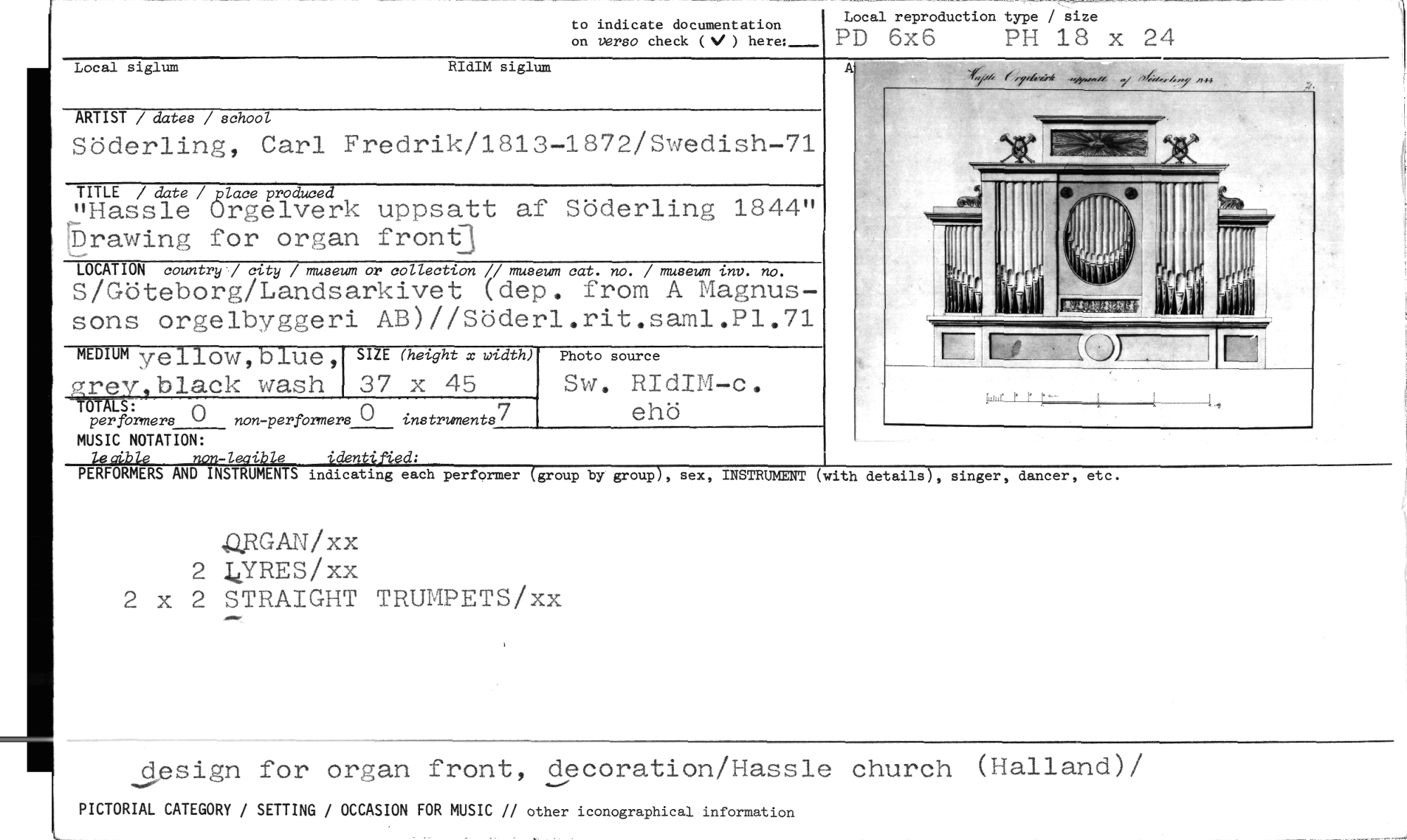 //// to indicate documentation //// Local reproduction type / size //// on verso check (V) here: PD 6x6 PH 18 x 24 //// Local siglum RIdIM siglum //// ARTIST / dater / school //// Söderling, Carl Fredrik/1813-1872/Swedish-71 //// TITLE / date /place produced //// Orgelverk rgelverk uppsatt af Söderling 1844" Drawing for organ front //// LOCATION country / city / museum or collection // museum cat. no. / museum inv. no. //// S/Göteborg/Landsarkivet (dep. from A Magnussons orgelbyggeri AB)//Söderl.rit.saml.P1.71 //// MEDIUM yellow,blue SIZE (hetght x width) Photo source //// sYre ,black wash 37 x 45 Sw. RIdIM-c. //// ehö //// L: instruments //// per formers non-performers 0 //// MUSIC NOTATION: //// lecible non-leaible identified; //// 6y 64.6, i 7 //// A //// PERFORMERS AND INSTRUMENTS indicating each performer (group by group), sex, INSTRUMENT (with details), singer, dancer, etc. //// „QRGAN/xx 2 WIRES/xx //// 2 x 2 STRAIGHT TRUMPETS/xx //// 25esign for organ front, decoration/Hassle church (Halland)/ //// PICTORIAL CATEGORY / SETTING / OCCASION FOR MUSIC // other iconographical information ////