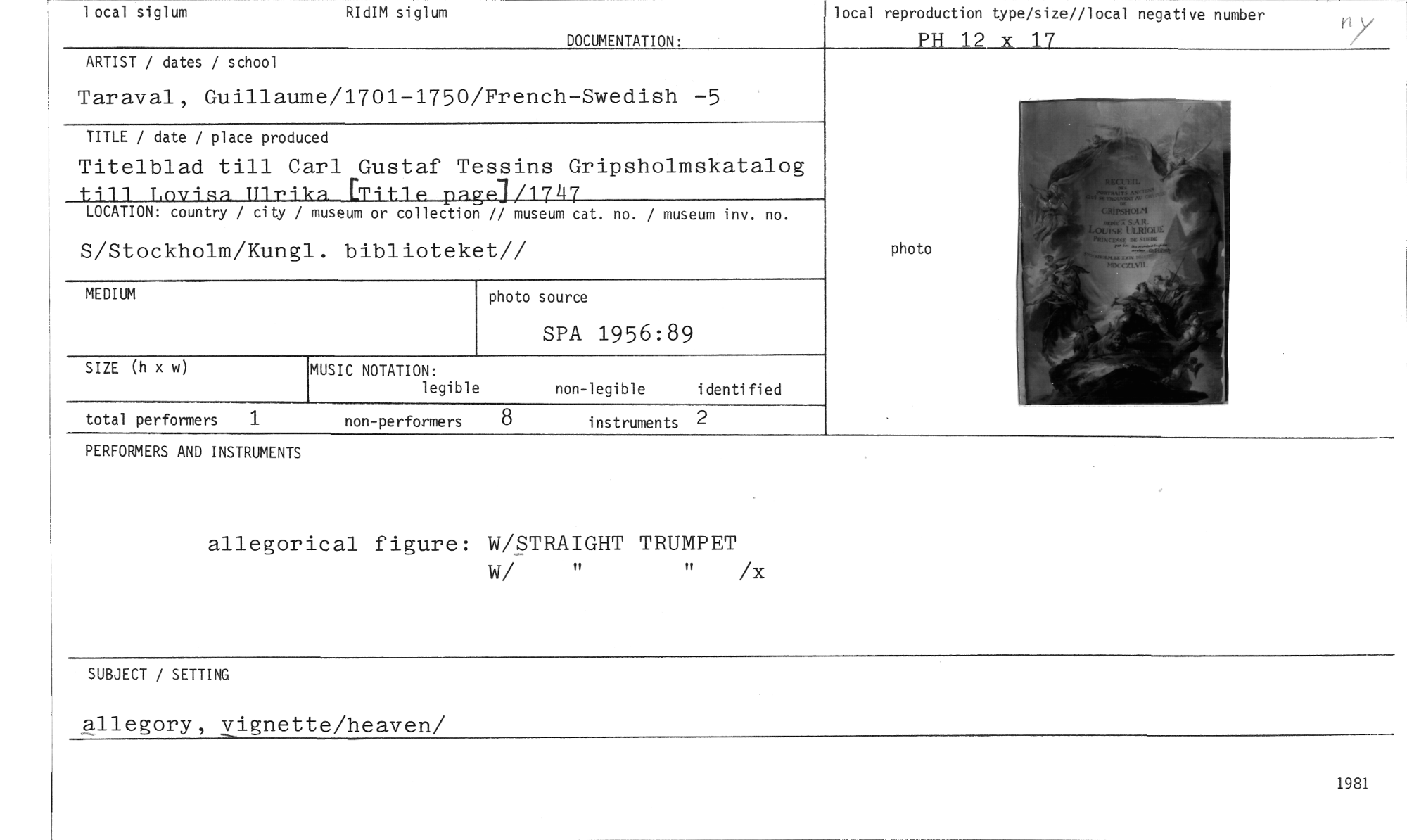 //// 1 ocal siglum RIdIM siglum //// DOCUMENTATION. //// local reproduction type/size//local negative number //// PH 12 x 17 //// ARTIST / dates / school //// Taraval, Guillaume/1701-1750/French-Swedish -5 //// TITLE / date / place produced //// Titelblad till Carl Gustaf Tessins Gripsholmskatalog //// till Lnvisa Ulrika [Title page]/1747 //// LOCATION: country / city / museum or collection // museum cat. no. / museum inv. no. //// S/Stockholm/Kungl. biblioteket// //// MEDIUM photo source //// SPA 1956:89 //// SIZE (h x w) MUSIC NOTATION: non-legible identified //// legible //// total performers 1 non-performers 8 instruments 2 //// PERFORMERS AND INSTRUMENTS //// photo //// allegorical figure: W/STRAIGHT TRUMPET //// W/ " /x //// SUBJECT / SETTING //// allegory, vignette/heaven/ //// 1931 ////