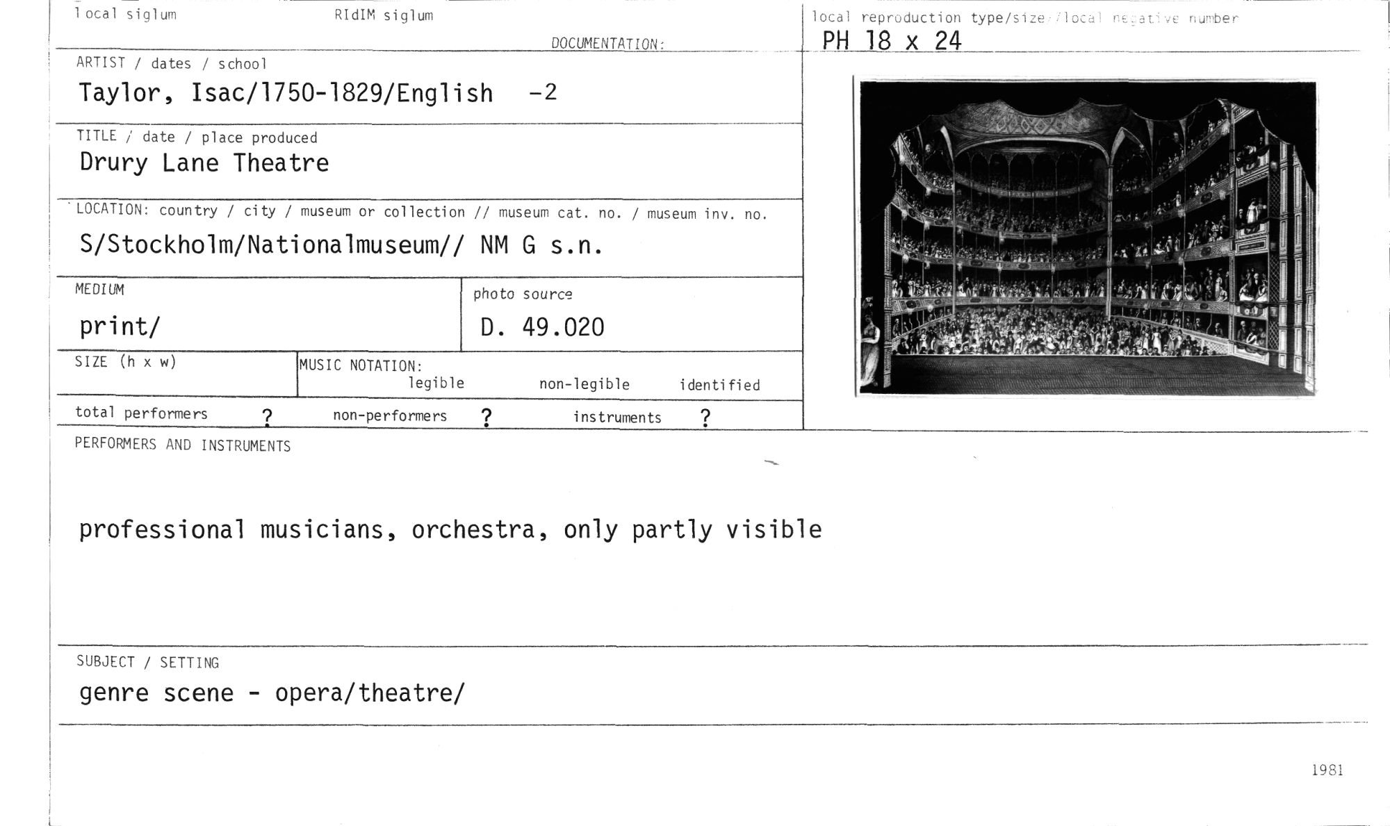 //// 1981 //// instruments //// non-performers //// total performers //// local reproduction type/size local neative nurober //// PH 18 x 24 //// ARTIST / dates / school //// Taylor, Isac/1750-1829/English -2 //// TITLE / date / place produced //// Drury Lane Theatre //// LOCATION: country / city / museum or collection // museum cat. no. / museum inv. no. //// S/Stockholm/Nationalmuseum// NM G s.n. //// photo source //// D. 49.020 //// SIZE (h x w) //// non-legible identified //// MEDIUM //// print/ //// MUSIC NOTATION: //// legible //// PERFORMERS AND INSTRUMENTS //// professional musicians, orchestra, only partly visible //// SUBJECT / SETTING //// genre scene - opera/theatre/ //// 1 otal siglum RIdIM siglum //// DOCUMENTATION: ////