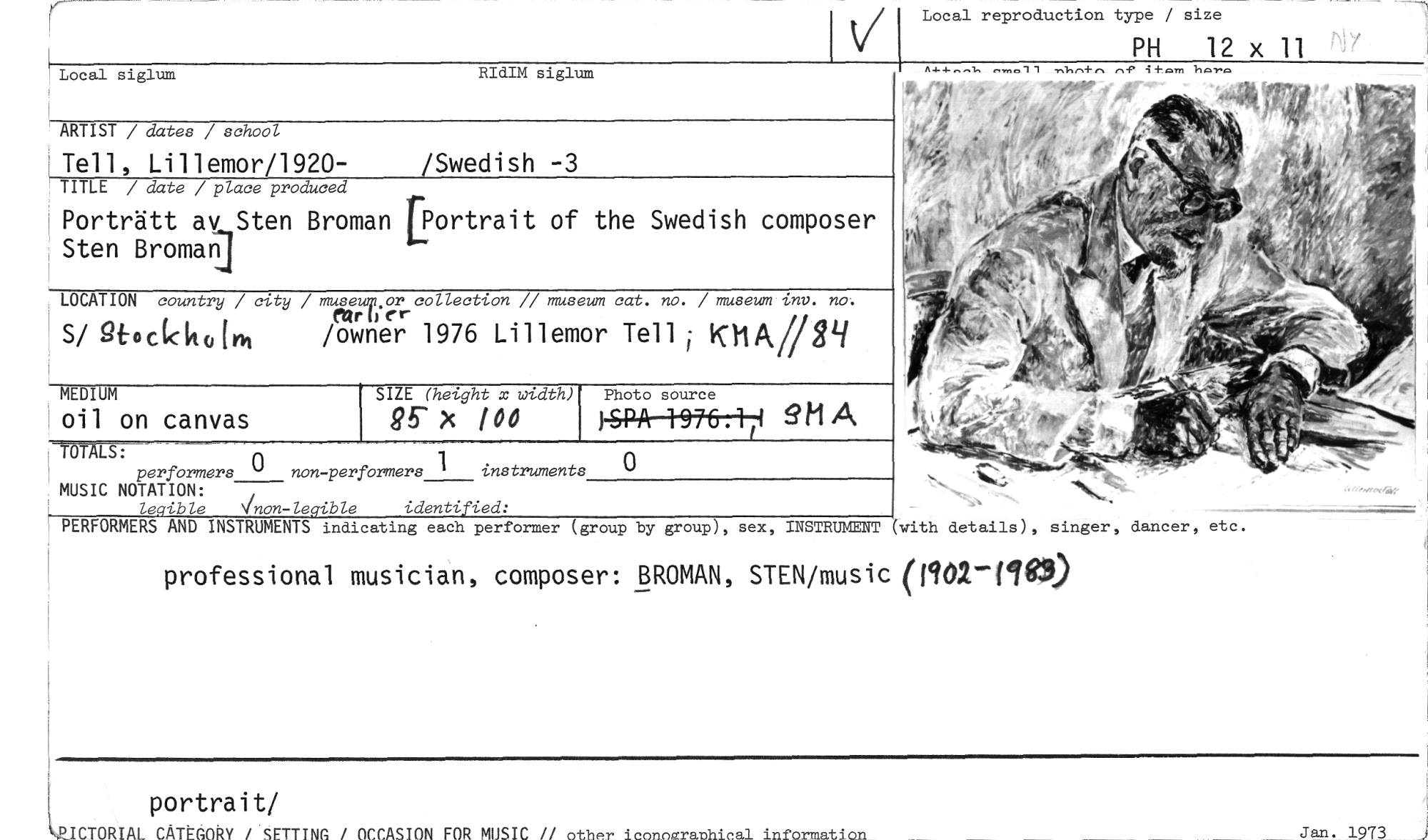 //// Local reproduction type / size //// Local sigium niui. s,6_,... //// ARTIST / dates / school //// Tell, Lillemor/1920- /Swedish -3 //// TITLE / date / place produced //// Porträtt av Sten Broman [Portrait of the Swedish composer Sten Bromag //// LOCATION country / city / mu&ein.grcollection // museum cat. no. / museum inc. no. //// S/ gbekkolni /owner 1976 Lillemor Tell - KhAllgq //// MEDIUM SIZE (height x width) Photo source //// oil on canvas 95" x I 0 ö )-6.1214-1-99fr:-1-1 SIM A //// 1 //// TÖTALS: //// performers non-performers instruments //// MUSIC NOTATION: , //// le.ible '/non-le.ible identi ied: //// PERFORMERS AND INSTRUMENTS indicating each performer (group by group), sex, INSTRUMENT (with details), singer, dancer, etc. //// professional musician, composer: BROMAN, STEN/music (1902 -fig» //// portrait/ //// 1,,RACTORIAL CATLGORY / SETTING / OCCASION FOR MUSIC // other iconaranhical information Jan. 1973 ////