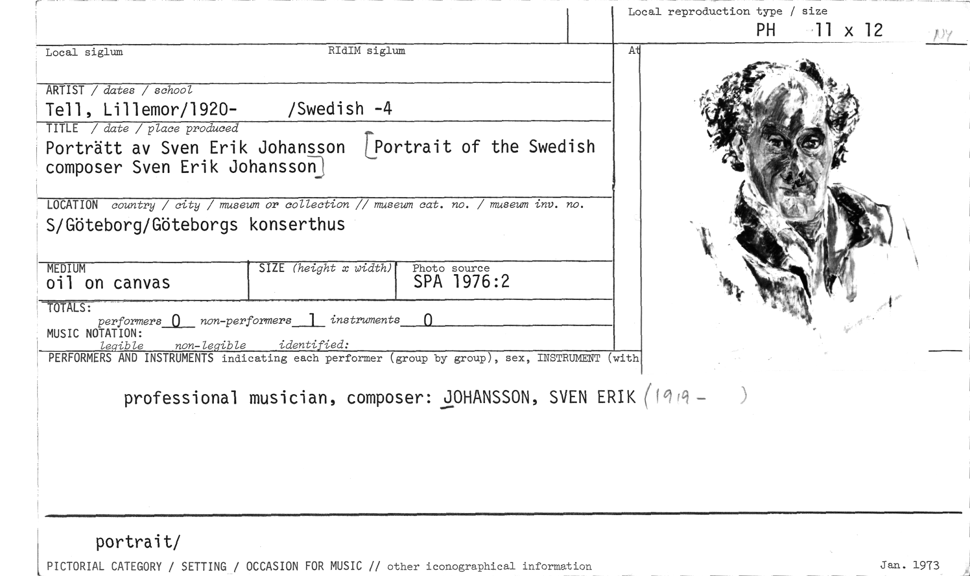 //// professional musician, composer: JOHANSSON, SVEN ERIK Wei — ) //// TOT //// LS: //// performers_a_ non-performers___1_ instruments MUSIC NOTATION: //// legible non-legible identified: //// PERFORMERS AND INSTRUMENTS indicating each performer (group by group), sex, INSTRUMENT (with //// n //// Local reproduction type / size //// PH 11 x 12 //// At //// SIZE (height x width) //// Photo source //// SPA 1976:2 //// MEDIUM //// oil on canvas //// ARTIST / dates / school //// Tell, Lillemor/1920- /Swedish -4 //// TITLE / date / place produced //// Porträtt av Sven Erik Johansson [Portrait of the Swedish composer Sven Erik Johansson) //// LOCATION country / city / museum or collection // museum cat. no. / museum inv. no. //// S/Göteborg/Göteborgs konserthus //// RIdIM siglum //// Local siglum //// portrait/ //// PICTORIAL CATEGORY / SETTING OCCASION FOR MUSIC // other iconographical information Jan. 1973 ////