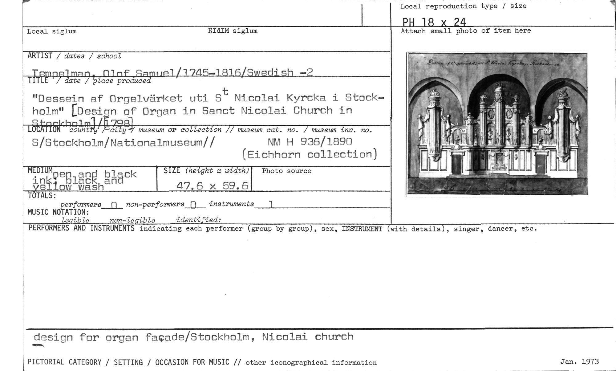 //// Local reproduction type / size //// Attach small photo of item here //// PH 18 x 24 //// Local siglum RIdIM siglum //// ARTIST / dates / school //// /174S-1 Al A/Swedish -2 //// TTRELP/P antl e place prfoduSce2rrit 121 d //// "Dessein af Orgelvärket uti St Nicolai Kyrcka i Stockholm" [Design of Organ in Sanct Nicolai Church in //// Lard1Whalg9/P9-83 //// count y ctty museum or collection // museum cat. no. / museum inv. no. //// S/Stockholm/Nationalmuseum// NM H 936/1890 //// (Eichhorn collection) //// e an bl ck //// MEDIUMp SIZE (height x width) Photo source //// I //// n lack d ann ank //// eilowb wash 47.6 x 59.6 //// T T LS: //// performers n non-performers_a_instruments MUSIC NOTATION: //// Zegible non-legible identified: //// 1 //// PERFORMERS AND INSTRUMENTS indicating each performer (group by group), sex, INSTRUMENT (with details), singer, dancer, etc. //// design for organ faade/Stockholm, Nicolai church //// PICTORIAL CATEGORY / SETTING / OCCASION FOR MUSIC // other iconographical information Jan. 1973 ////