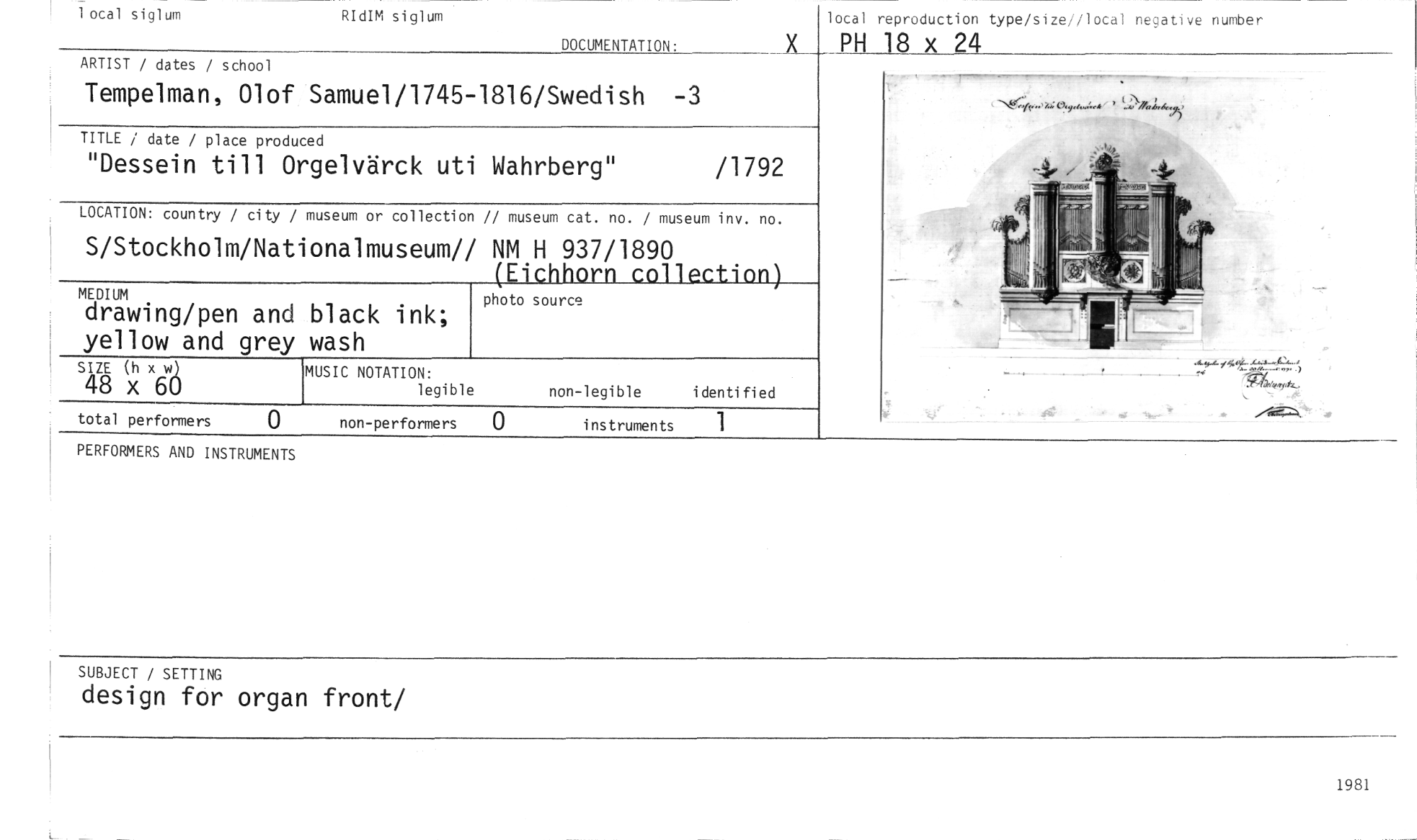 //// local siglum RIdIM siglum local reproduction type/size//local negative number //// DOCUMENTATION: K PH 18 X 24 //// PERFORMERS AND INSTRUMENTS //// SUBJECT / SETTING //// design for organ front/ //// 1981 //// ARTIST / dates / school //// Tempelman, Olof Samuel/1745-1816/Swedish -3 //// TITLE / date / place produced //// "Dessein till Orgelvärck uti Wahrberg" /1792 //// LOCATION: country / city / museum or collection // museum cat. no. / museum inv. no. //// SiStockholm/Nationalmuseum// NM H 937/1890 //// (Eichhorn collection)___ //// photo source //// SIZE (h x wå //// 48 x 6 //// total performers 0 non-performers 0 instruments 1 //// MEDIUM //// drawing/pen and black ink; //// yellow and grey wash //// MUSIC NOTATION: //// legible non-legible identified ////