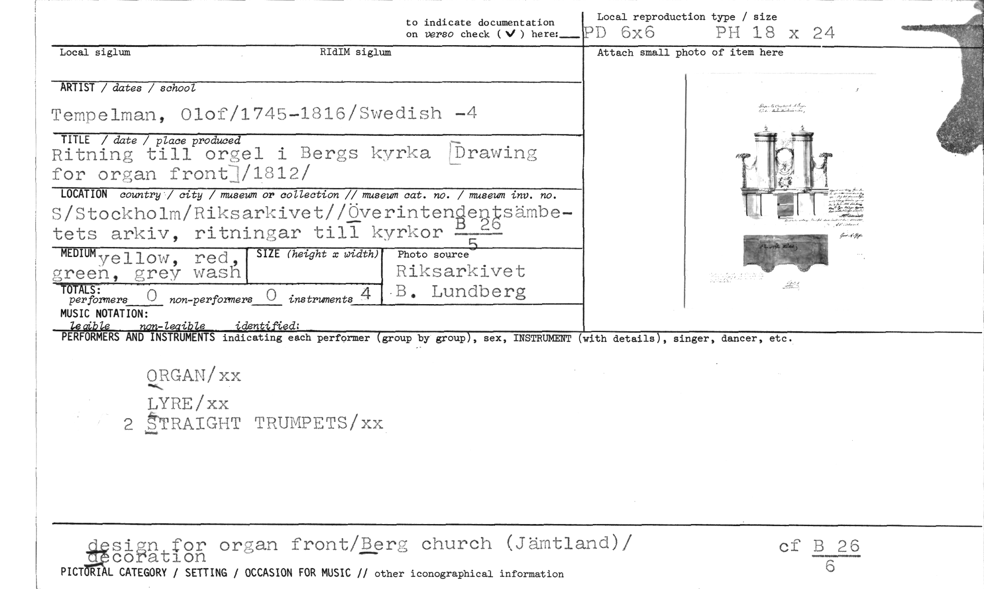 //// to indicate documentation on versa check ( f ) here: //// Local reproduction type / size //// PI) 6x6 PH 18 x 24 //// Local siglum RIdIM siglum //// ARTIST / dates / school Attach small photo of item here //// Tempelman, Olof/1745-1816/Swedish -4 //// TITLE / date / place produmd //// Ritning till orgel i Bergs kyrka rbrawing for organ front-1/1812/ //// LOCATION country / city / museum or collection // museum cat. no. / museum inv. no. //// SIZE (height x width) //// TRÅLS: //// per formers 0 non-perfbrmers 0 instruments //// MUSIC NOTATION: //// ncn-leaible identif4ed: //// PERFORMERS AND INSTRUMENTS indicating each performer (group by group), sex, INSTRUMENT (with details), singer, dancer, etc. //// ORGAN/xx //// LYRE/xx //// 2 tTRAIGHT TRUMPETS/xx //// S/Stockholm/Riksarkivet//Överintenge9gsämbetets arkiv, ritningar till kyrkor D- //// MEDIM //// yel.low, red, green, grey wash //// ',hot..5 //// Riksarkivet //// B. Lundberg //// simn f or organ front/Berg church (Jämtland)/ coration //// XPICT RI L CATEGORY / SETTING / OCCASION FOR MUSIC // other iconographical information //// cf B 26 //// 6 ////