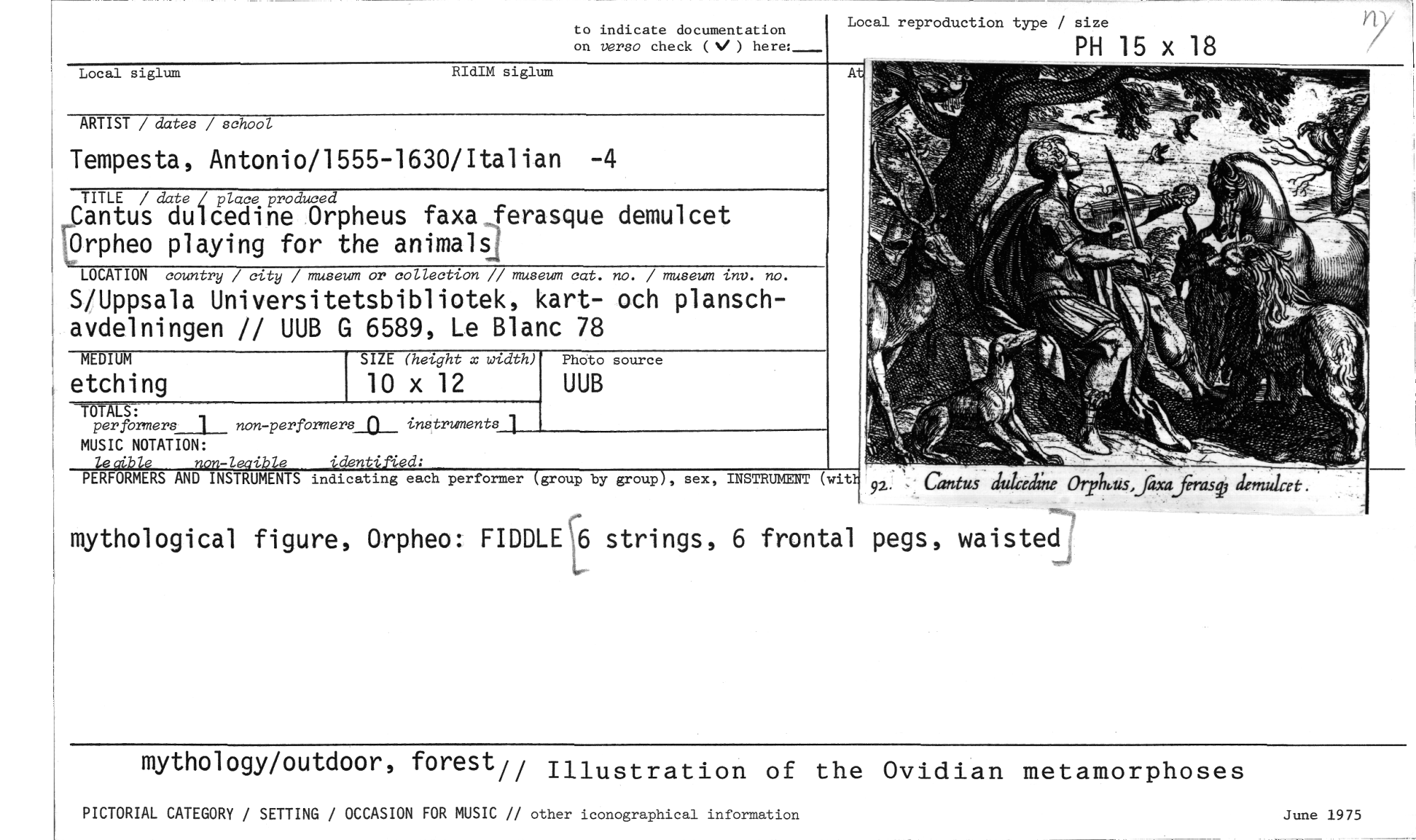 //// to indicate documentation //// on verso check ( ) here:_ //// Local reproduction type / size //// PH 15 x 18 //// Local siglum RIdIM siglum //// At //// ARTIST / dates / school //// Tempesta, Antonio/1555-1630/Italian -4 //// TITLE / dateI place produced //// Cantus duicedine Orpheus faxa ferasque demulcet Orpheo playing for the animalsj //// LOCATION country / city / museum or collection // museum cat. no. / museum inv. no. //// S/Uppsala Universitetsbibliotek, kart- och planschavdelningen // UUB G 6589, Le Blanc 78 //// MEDIUM //// etching //// SIZE (height x width) //// 10 x 12 //// Photo source //// UUB //// -TOTALS: //// perfbrmers 1 non-perfomners_Q_ instruments //// MUSIC NOTATION: //// leatb/e non-leaible identifi,ed; //// PERFORMERS AND INSTRUMENTS indicating each performer (group by group), sex, INSTRUMENT (witt 92. //// Cantus dulculiare Orphus,faxaferasp kmulat. //// mythological figure, Orpheo: FIDDLE 6 strings, 6 frontal pegs, waisted //// mythology/outdoor, forestii Illustration of the Ovidian metamorphoses //// PICTORIAL CATEGORY / SETTING / OCCASION FOR MUSIC // other iconographical information //// June 1975 ////