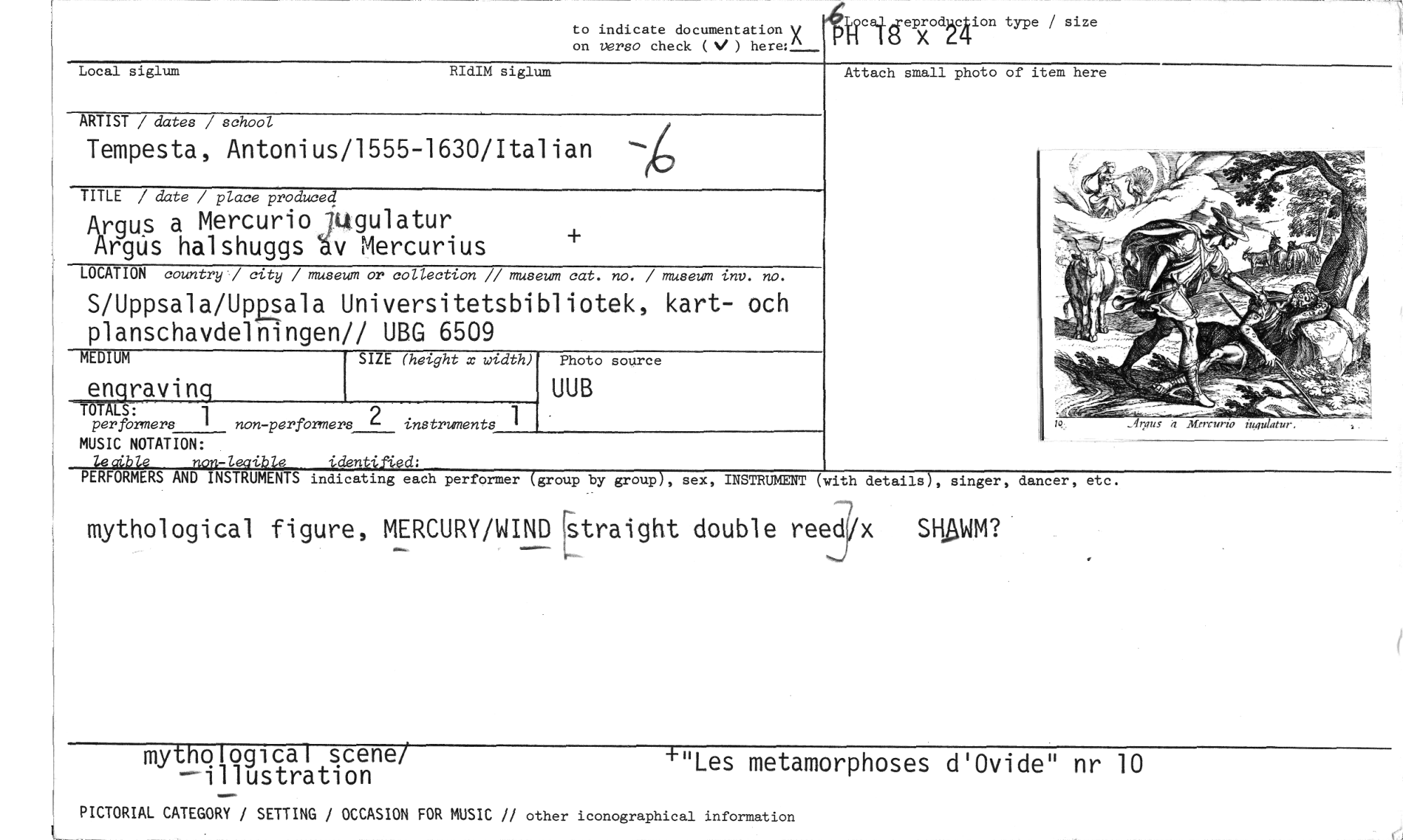 //// to indicate documentation X on verso check (V) here: //// tratsepkodnion type / size //// ARTIST / dates / school //// Tempesta, Antonius/1555-1630/Italian //// TITLE / date / place produced //// Argus a Mercuriougulatur Argds halshuggs 'v Mercurius //// LOCATION country / city / museum or collection // museum cat. no. / museum inv. no. //// S/Uppsala/Uppsala Universitetsbibliotek, kart- och planschavdelningen// UBG 6509 //// MEDIUM SIZE (height x width) //// engravinq //// MTALST:" //// per formers 1 non-performers 2 instruments 1 MUSIC NOTATION: //// lecible identifted: //// PERFORMERS AND INSTRUMENTS indicating each performer (group by group), sex, INSTRUMENT (with details), singer, dancer, etc. //// mythological figure, MERCURY/WIND kraight double reeyx ShAWM? //// mythologicai scene/ //// --illustration //// -"Les metamorphoses d'Ovide" nr 10 //// Local siglum RIdIM siglum //// Attach small photo of item here //// Photo source //// UUB //// PICTORIAL CATEGORY / SETTING / OCCASION FOR MUSIC // other iconographical information ////