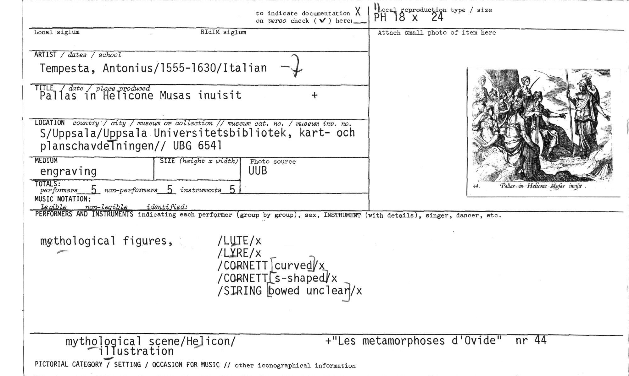 //// to indicate documentation X on verso check (%1 ) here:- //// Itocal reprox ducti4n type / size //// PH 18 2 //// Local siglum RIdIM siglum Attach small photo of item here //// ARTIST / dates / school //// Tempesta, Antonius/1555-1630/Italian //// TITLE J date ./ placeicroduced //// Pallas in Helicone Musas inuisit //// LOCATION country./ city / museum or collection // museum cat. no. / museum inv. no. //// S/Uppsala/Uppsala Universitetsbibliotek, kart- och planschavdelningen// UBG 6541 //// SIZE (hetght x width) //// TWALS: //// per formers 5 non -performers_5_ instruments //// MUSIC NOTATION: //// lealble non-leaibie identified: //// PERFORMERS AND INSTRUMENTS indicating each performer (group by group), sex, INSTRUMENT //// mythological figures, /LUTE/x //// /LIRE/x //// /CORNETT curved x /COREETT s-shapech /ST.RING bowed uncleaj/x //// MEDIUM //// engraving //// Photo source //// UUB //// etc. //// (with details), singer, dancer, //// mythological scene/Helicon/ --illustration 1-"Les metamorphoses d'Ovide" nr 44 //// PICTORIAL CATEGORY / SETTING / OCCASION FOR MUSIC // other iconographical information ////