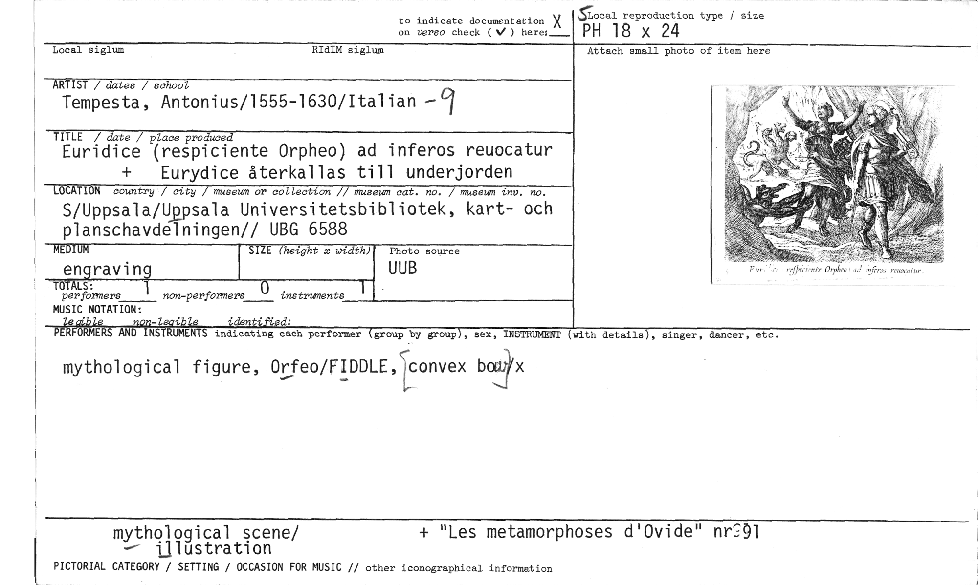 //// to indicate documentation X on verso check ) here:- //// SLocal reproduction type / size //// PH 18 x 24 //// Local siglum RIdIM siglum //// ARTIST / dates / school //// Tempesta, Antonius/1555-1630/Italian —9 //// TITLE / date / place produced //// Euridice (respiciente Orpheo) ad inferos reuocatur + Eurydice återkallas till underjorden //// LOCATION country / city / museum or collection // museum cat. no. / museum inv. no. //// S/Uppsala/Uppsala Universitetsbibliotek, kart- och planschavdelningen// UBG 6588 //// Photo source //// •ravin• UUB //// Te 'LS: //// per formers 1 non-perfbrmers instruments //// MUSIC NOTATION: //// lecible non-lecible identified; //// MEDIUM SIZE (height x width) //// Attach small photo of item here //// PERFORMERS AND INSTRUMENTS indicating each performer (group by group), sex, INSTRUMENT (with details), singer, dancer, etc. //// mythological figure, Orfeo/FIDDLE,Convex boa4x //// mythological scene/ //// -- illustration //// PICTORIAL CATEGORY / SETTING / OCCASION FOR MUSIC // other iconographical information //// + "Les metamorphoses d'Ovide" nr?91 ////