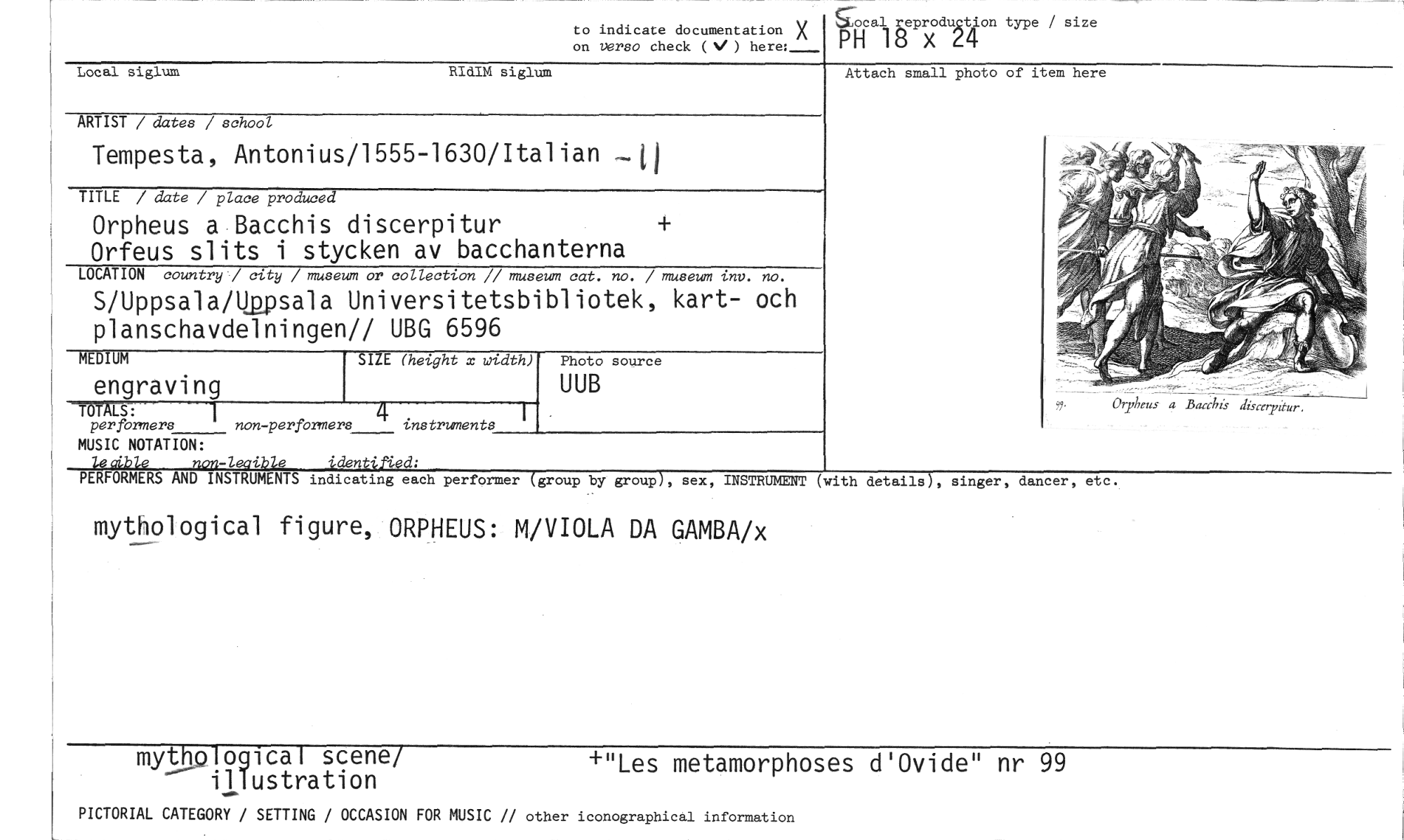 //// to indicate documentation X on versa check (V) here:_ //// go al åex M produ bion type / size //// ho 1 . //// ARTIST / dates / school //// Tempesta, Antonius/1555-1630/Italian -.1 //// TITLE / date / place produced //// Orpheus a Bacchis discerpitur //// Orfeus slits i stycken av bacchanterna //// LOCATION country7 city / museum or collection // museum cat. no. / museum inv. no. //// SappsalaNgpsala Universitetsbibliotek, kart- och planschavdelningen// UBG 6596 //// MEDIUM SIZE (height x width) Photo source //// engraving UUB //// TST LS: //// per formers non-performers instruments //// MUSIC NOTATION: //// le aible non-leaible identifted: //// PERFORMERS AND INSTRUMENTS indicating each performer (group by group), sex, INSTRUMENT (with details), singer, dancer, etc. //// mythological figure, ORPHEUS: M/VIOLA DA GAMBA/x //// mythological scene/ -"Les metamorphoses d'Ovide" nr 99 //// -- illustration //// Local siglum RIdIM siglum //// Attach small pho o of item here //// PICTORIAL CATEGORY / SETTING / OCCASION FOR MUSIC // other iconographical information ////