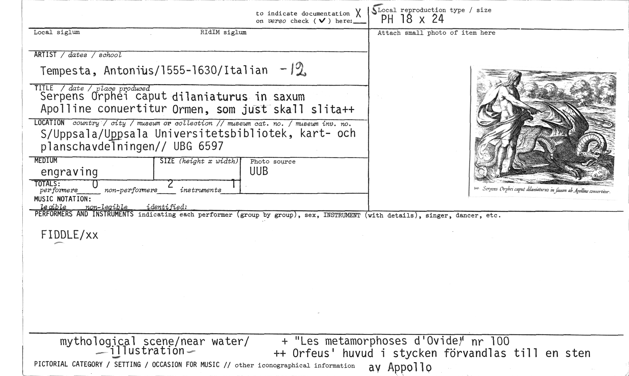 //// Attach small photo of item here //// ARTIST / dates / school //// Tempesta, Antonibs/1555-1630/Italian //// TITLE / date /place produced //// Serpens Grphei caput dilani.aturus in saxum Apolline conuertitur Ormen, som just skall slita++ //// LOCATION country / city / museum or collection // museum cat. no. / museum inp. no. //// 5/Uppsala/Uppsala Universitetsbibliotek, kart- och planschavdelningen// UBG 6597 //// SIZE (height x width) //// e LS: //// per formers non-perfbrmers instruments //// MUSIC NOTATION: //// non-leaible ¢dentif ed: //// PERFORMERS AND INSTRUMENTS indicating each performer (group by group), sex, INSTRUMENT (with details), singer, dancer, etc. //// FIDDLE/xx //// mythological scene/near water/ + "Les metamorphoses d'Ovid0 nr 100 //// —illustration— ++ Orfeus' huvud i stycken förvandlas till en sten //// PICTORIAL CATEGORY / SETTING / OCCASION FOR MUSIC // other iconographical information ati lo //// Ap 17'w //// MEDIUM //// engraving //// Photo source //// UUB //// RIdIM siglum //// to indicate documentation X ,4Local reproduction type / size on verso check (V ) here:___ PH 18 X 24 ////