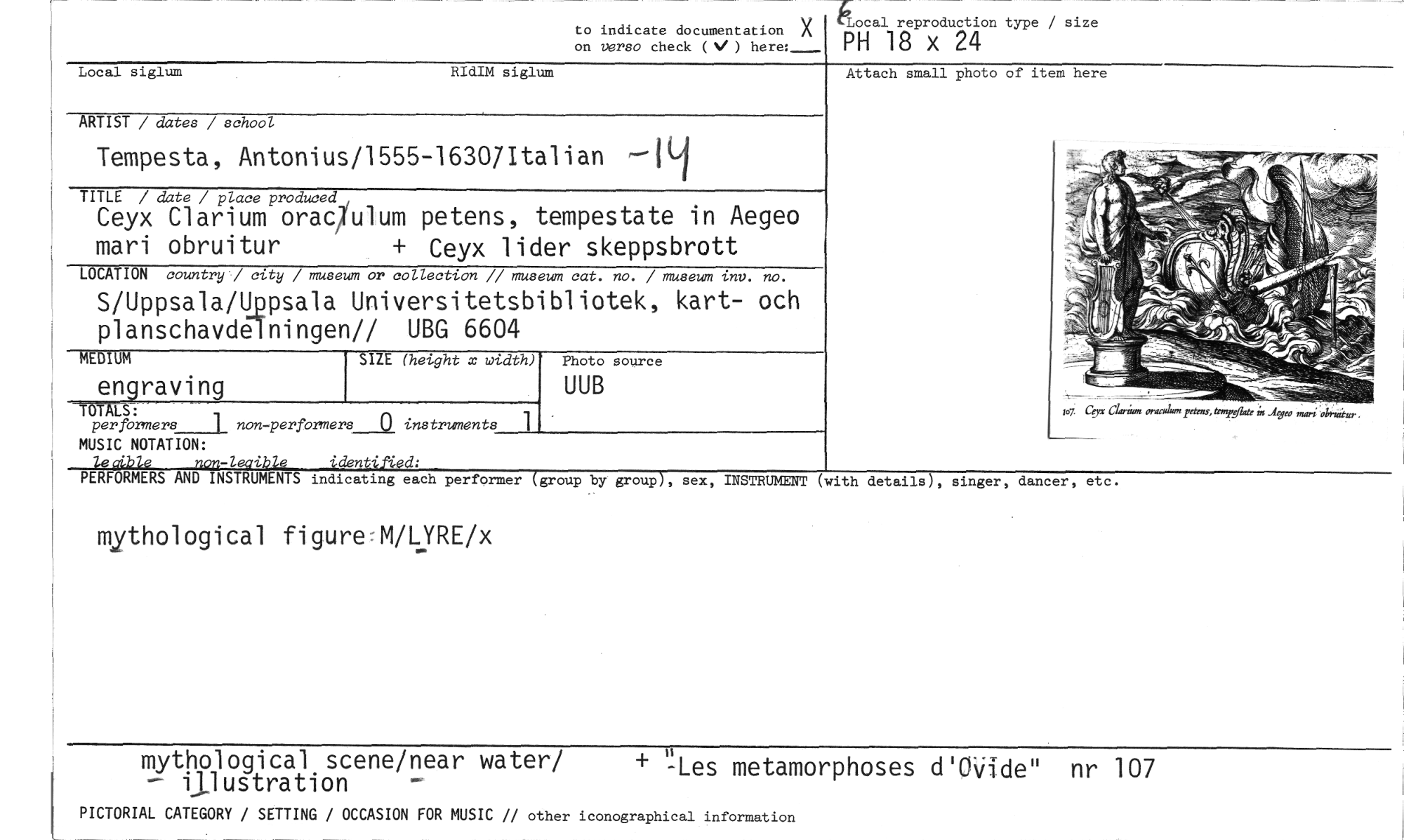 //// mythological scene/near water/ — illustration -'Les metamorphoses d'OVide" nr 107 //// PICTORIAL CATEGORY / SETTING / OCCASION FOR MUSIC // other iconographical information //// RIdIM siglum //// Local siglum //// Attach small photo of item here //// to indicate documentation A //// V focal reproduction type / size //// on verso check (V ) here: PH 18 X 24 //// ARTIST / dates / school //// Tempesta, Antonius/1555-16307Italian --Ill //// TITLE / date / place produced //// Ceyx Clarium orac7ulum petens, tempestate in Aegeo mari obruitur + Ceyx lider skeppsbrott //// LOCATION country / city / museum or collection // museum cat. no. / museum inp. no. //// S/Uppsala/Uppsala Universitetsbibliotek, kart- och planschavdelningen// UBG 6604 //// MEDIUM SIZE (height x width) //// en raving //// Photo source //// UUB //// T IS: //// performers_l_ non-performers 0 instruments //// MUSIC NOTATION: //// le aible non-legible identified: //// PERFORMERS AND INSTRUMENTS indicating each performer (group by group), sex, INSTRUMENT (with details), singer, dancer, etc. //// mythological figure:M/LYRE/x ////