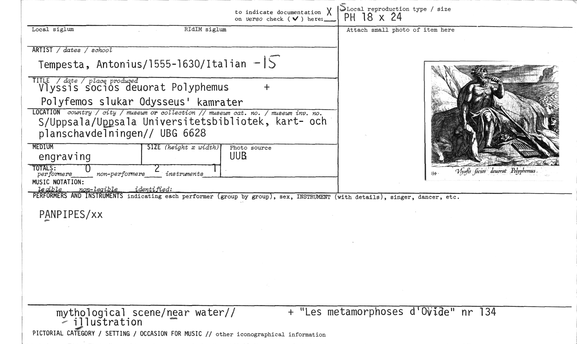 //// to indicate documentation X on versa check (V) //// SLocal reproduction type / size //// PH 18 x 24 //// Attach small photo of item here //// ARTIST / dates / school //// Tempesta, Antonius/1555-1630/Italian -IS //// TITLE / date / place produqed //// Vlyssis socios deuorat Polyphemus Polyfemos slukar Odysseus' kamrater //// LOCATION country / city / museum or collection // museum cat. no. / museum inv. no. //// S/Uppsala/Ugpsala Universitetsbibliotek, kart- och planschavdelningen// UBG 6628 //// SIZE (height x width) //// MALS: . //// per formers non-perfbrmers instruments //// MUSIC NOTATION: //// leaible non-leaible identified; //// PERFORMERS AND INSTRUMENTS //// PANPIPES/xx //// MEDIUM //// engraving //// Photo source //// UUB //// indicating each performer (group by group), sex, INSTRUMENT (with details), singer, dancer, etc. //// Local siglum //// RIdIM siglum //// mythological scene/near water// - illustration //// PICTORIAL CATEGORY / SETTING / OCCASION FOR MUSIC // other iconographical information //// + "Les metamorphoses d'OVide" nr 134 ////