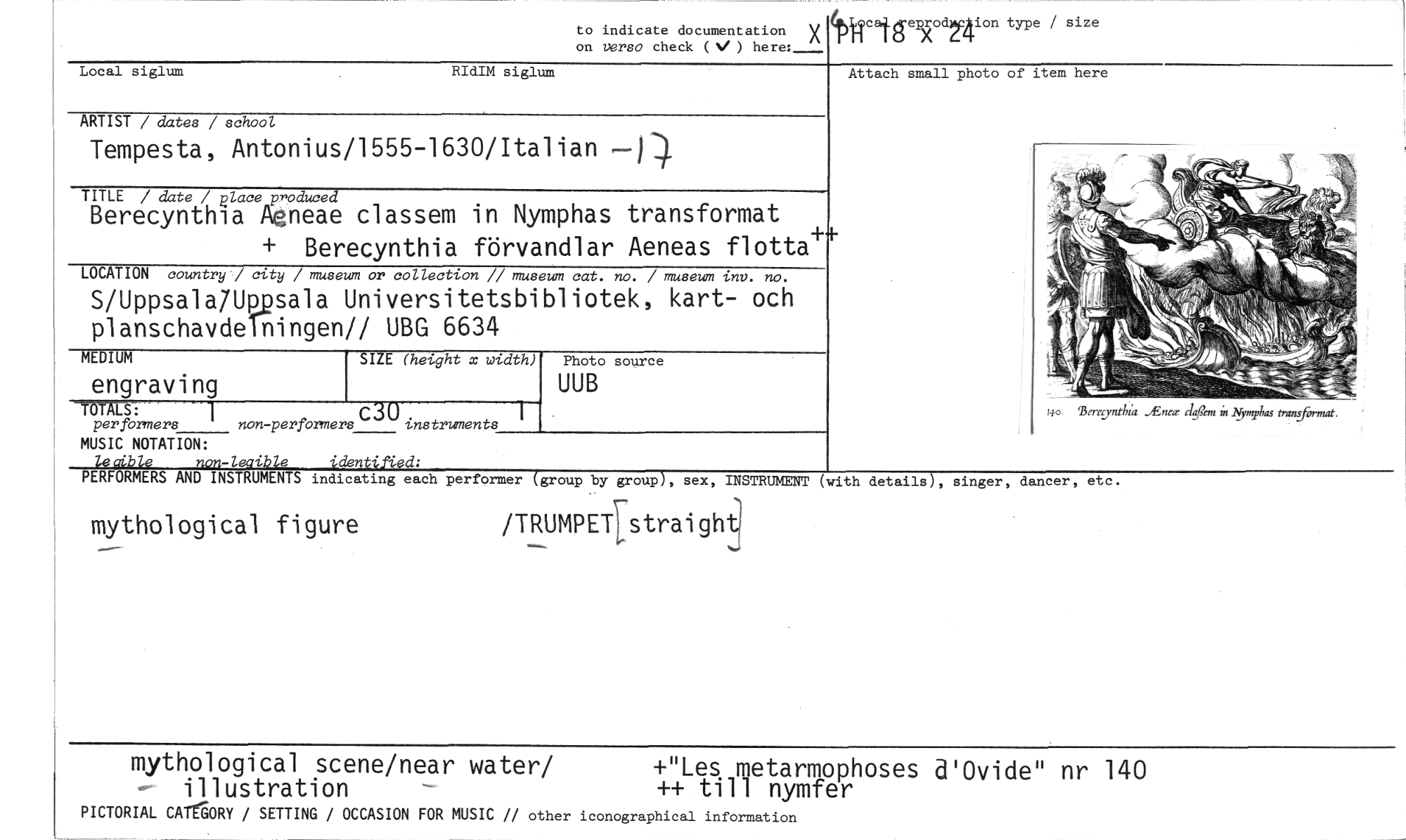 //// to indicate documentation X //// on versa check (V ) here:_ //// (pirtgesrednion type / size //// Local siglum RIdIM siglum //// ARTIST / dates / school //// Tempesta, Antonius/1555-1630/Italian //// TITLE / date / place pnoduced //// Berecynthia Agneae classem in Nymphas transformat Berecynthia förvandlar Aeneas flotta+ //// LOCATION country / city / museum or collection // museum cat. no. / museum inv. no. //// S/Uppsala7Upsala Universitetsbibliotek, kart- och //// planschavde ningen// UBG 6634 //// Attach small photo of item here //// MEDIUM SIZE (height x width) //// engraving //// per formers non-perfOrmers instruments //// MUSIC NOTATION: //// lecible non-leaible identified: //// PERFORMERS AND INSTRUMENTS //// Photo source //// UUB //// singer, dancer, //// etc. //// indicating each performer (group by group), sex, INSTRUMENT (with details), //// mythological figure /TRUMPET5traightl //// mythological scene/near water/ +"Les metarmophoses d'Ovide" nr 140 //// illustration ++ till nymfer //// PICTORIAL CATraRY / SETTING / OCCASION FOR MUSIC // other iconographical information ////