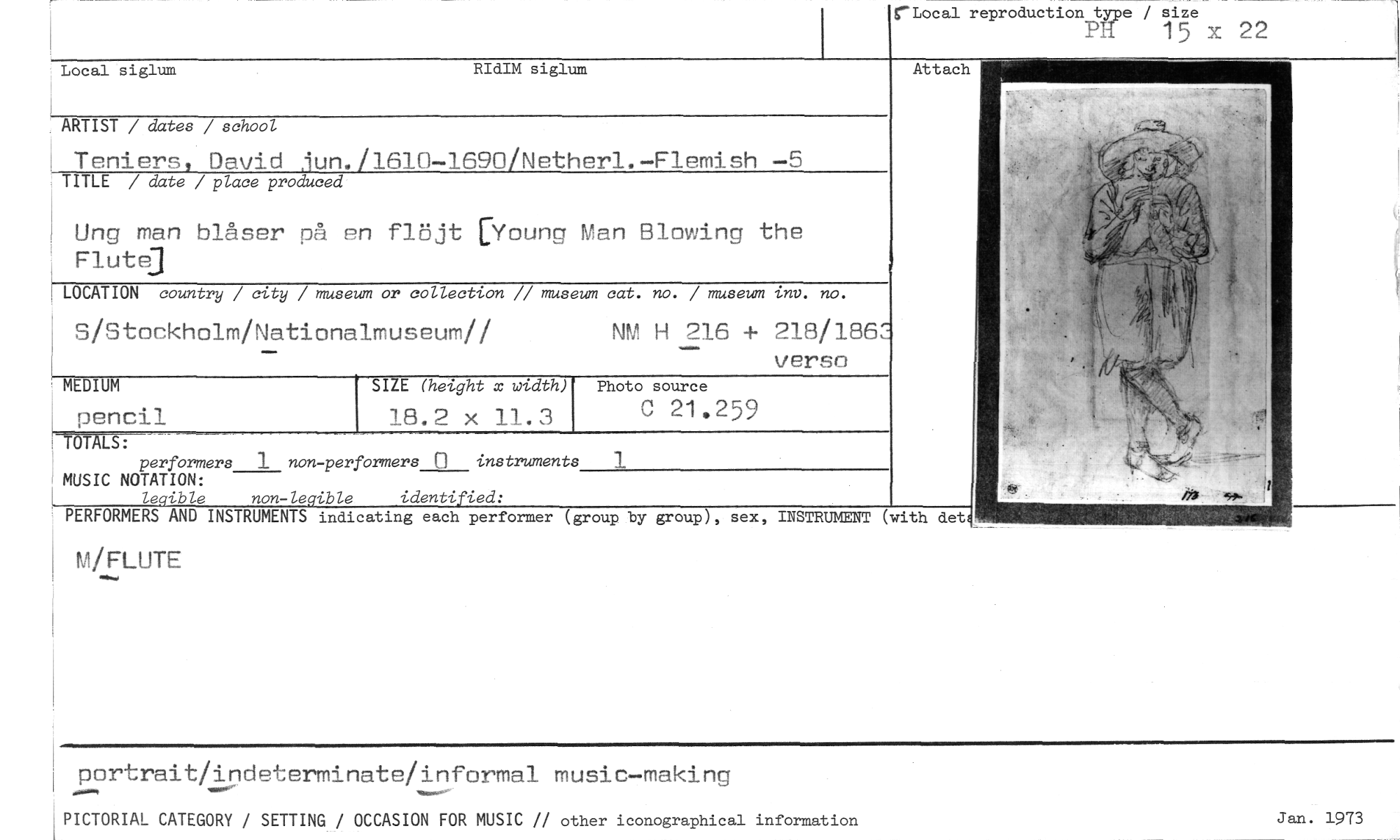 //// rLocal reproduction type / size //// inr 15 x 22 //// Local siglum RIdIM siglum //// ARTIST / dates / school //// Teniers, David Aun./1610-1690/Nether1.—Flemish —5 //// TITLE / date / place produced //// Ung man blåser på en flöjt [Young Man Blowing the Fl ute] //// LOCATION country / city / museum or collection // museum cat. no. / museum inv. no. //// S/Stockholm/Nationalmuseumfl NM H 216 218/1862 //// verso //// MEDIUM SIZE (height x width) //// pencil 18.2 x 11.3 //// TOT LS: //// performers 1 non-performers 0 instruments MUSIC NOTATION: //// PERFORMERS AND INSTRUMENTS indicating each performer (group by group), sex, INSTRUMENT (with dete_ legible non-legible identified: //// M/FLUTE //// Attach //// Photo source //// C 21.259 //// 1 //// portrait/indeterminate/informal music—making //// HICTORIAL CATEGORY / SETTING / OCCASION FOR MUSIC // other iconographical information //// Jan. 1973 ////