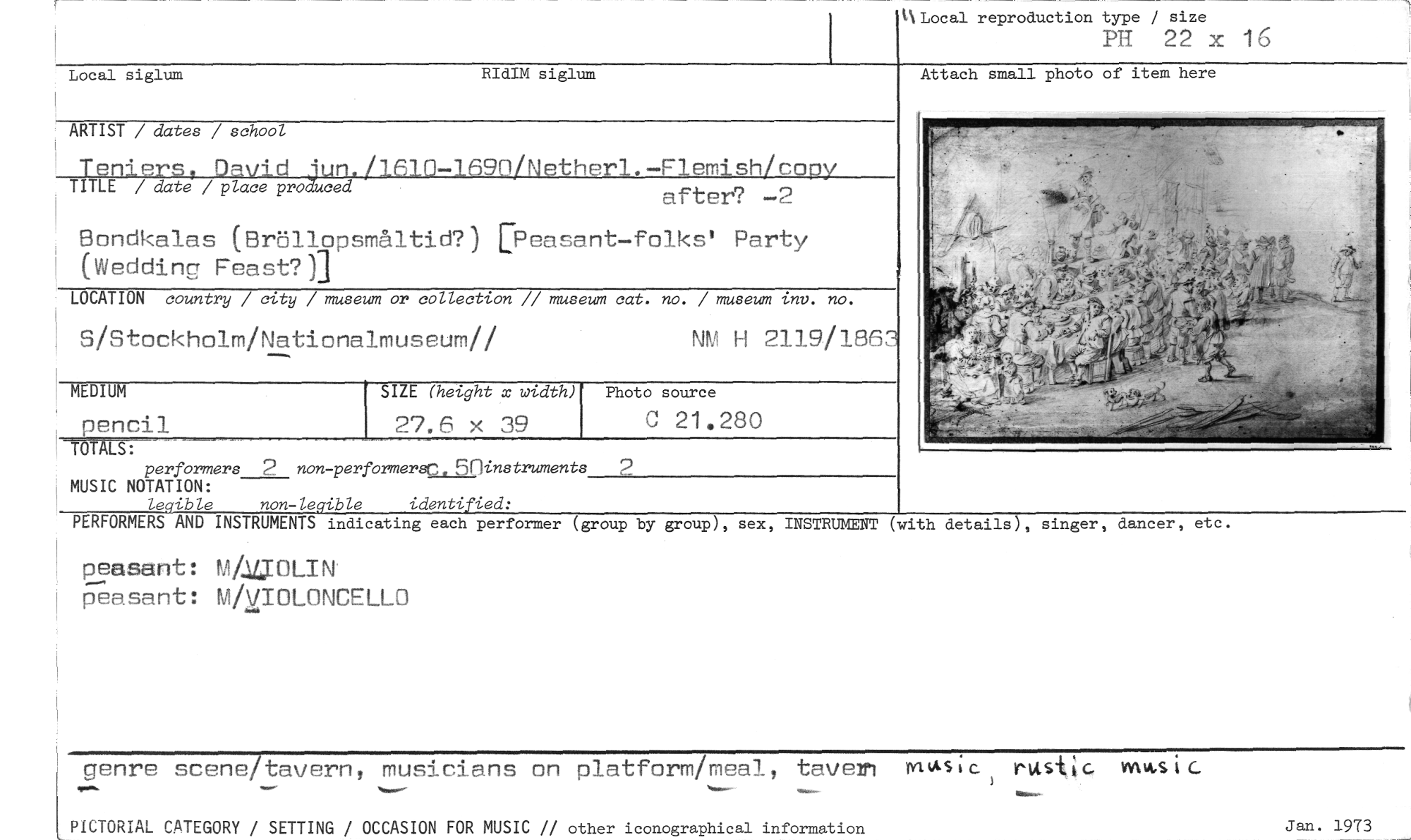 //// genre scene/tavern, musicians on platform/meal, taven TYRAS I C r1.4.5 ic mwsi C. //// ,111•••••-• //// MEDIUM //// SIZE (height x width) //// Local siglum RIdIM siglum //// (\Local reproduction type size //// Pil 22 x 16 //// ARTIST / dates / school //// Ten Ters, David jun./1610-1690/Nether1,—Flemish/copy //// TITLE / date / place produced //// efter? —2 //// Bondkalas (Bröllopsmåltid?) [Peasant—folks' Party (Wedding Feast?)] //// LOCATION country / city / museum or collection // museum cat. no. / museum inv. no. //// S/Stockholm/Nationa1museum// NM H 2119/1863 //// pencil 27.6 x 39 //// performers 2 non-perforrnerse. Sflinstruments MUSIC NOTATION: //// legible non-legible identified: //// PERFORMERS AND INSTRUMENTS indicating each performer (group by group), sex, INSTRUMENT (with //// peasant: MUJOLIN' 15easant: M/VIOLONCELLO //// Photo source //// C 21.280 //// details), singer, dancer, etc. //// Attach small photo of item here //// PICTORIAL CATEGORY / SETTING / OCCASION FOR MUSIC // other iconographical information //// Jan. 1973 ////