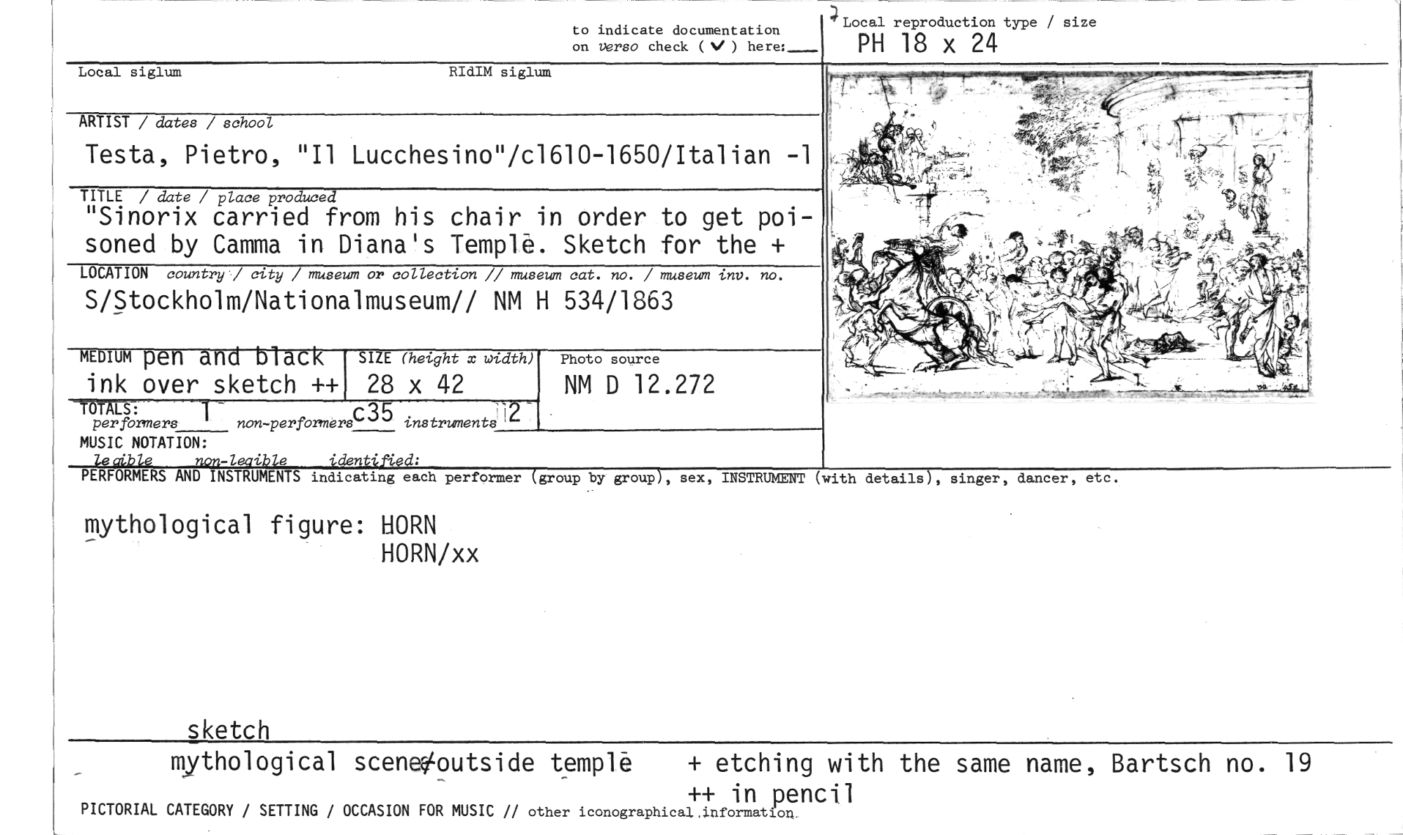 //// to indicate documentation on verso check (V ) here: //// Local reproduction type / size //// PH 18 x 24 //// Local siglum RIdIM siglum //// ARTIST / dates / school //// Testa, Pietro, "Il Lucchesino"/c1610-1650/Italian - //// TITLE / date / place produced //// "Sinorix carried from his chair in order to get poisoned by Camma in Diana's TempU. Sketch for the + //// LOCATION country / city / museum or collection // museum cat. no. / museum inv. no. //// S/Stockholm/Nationalmuseum// NM H 534/1863 //// ink over sketch ++ //// MALS:E315 //// per formers 1 non-perfbrmers instruments ' //// MEDIUM pen and black //// SIZE (height x width) Photo source //// 28 x 42 NM D 12.272 //// //// MUSIC NOTATION: //// leaible non-leaible identified: //// PERFORMERS AND INSTRUMENTS indicating each performer //// mythological figure: HORN //// HORN/xx //// sketch //// (group by group), sex, INSTRUMENT (with details), singer, dancer, etc. //// mythological sceneYoutside templ + etching with the same name, Bartsch no. 19 //// ++ in pencil //// PICTORIAL CATEGORY / SETTING / OCCASION FOR MUSIC // other iconographical information ////