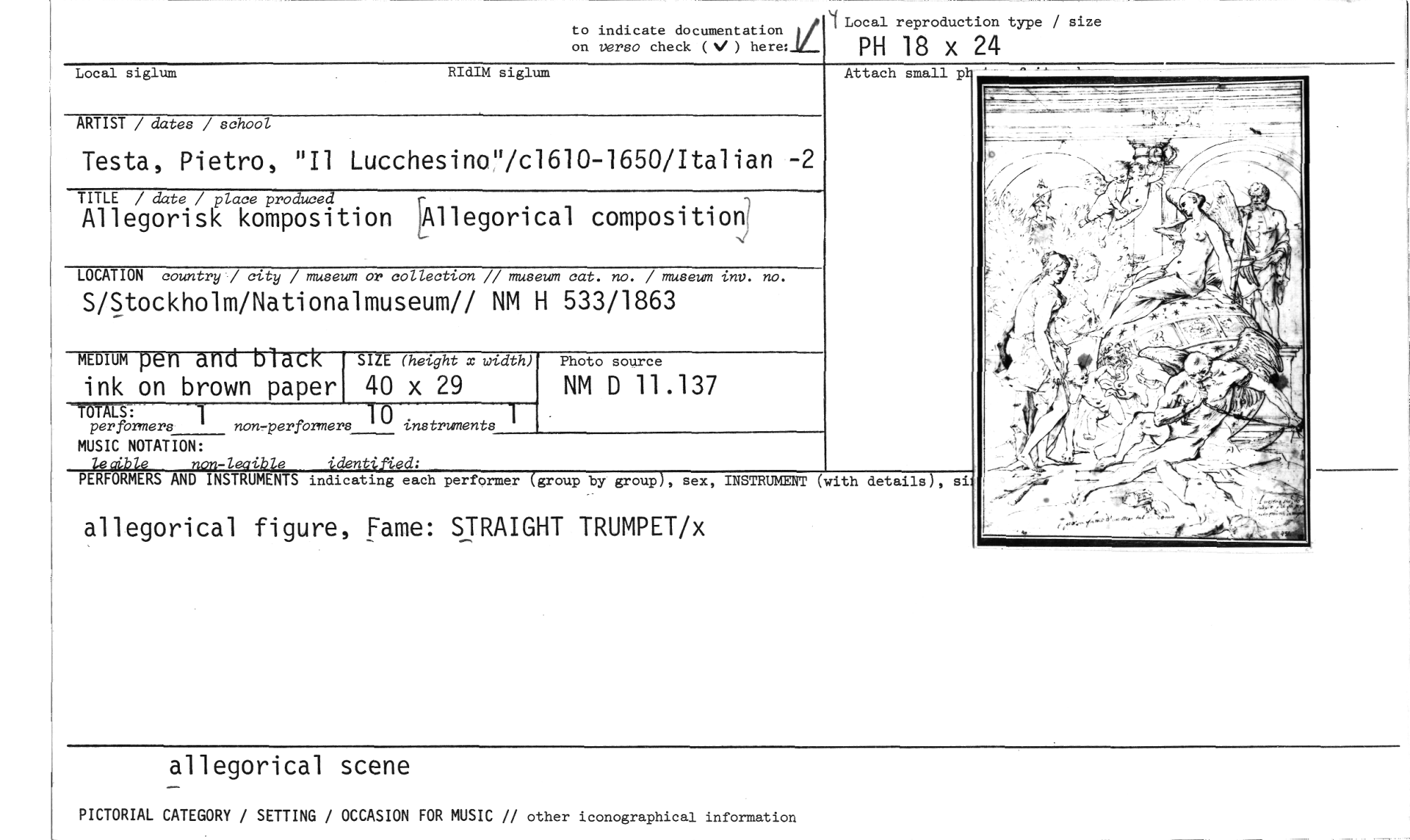 //// to indicate documentation ve //// on verso check (V ) here: //// Local reproduction type / size //// PH 18 x 24 //// Local siglum RIdIM siglum //// Attach small pl._ //// ARTIST / dates / school //// Testa, Pietro, "Il Lucchesino"/c1610-1650/Italian - //// TITLE / date / place produced //// Allegorisk komposition l'Allegorical compositio //// LOCATION country / city / museum or collection // museum cat. no. / museum inv. no. //// S/Stockholm/Nationalmuseum// NM H 533/1863 //// MEDIUM pen and black //// Photo source //// NM D 11.137 //// SIZE (height x width) //// 40 x 29 //// ink on brown paper //// TOTALS: //// per formers //// 1 //// 10 //// non,performers instrnenents 1 //// MUSIC NOTATION: //// lecible nan-leaible identified; //// PERFORMERS AND INSTRUMENTS indicating each //// performer (group by group), sex, INSTRUMENT (with details), si- //// allegorical figure, Fame: STRAIGHT TRUMPET/x //// allegorical scene //// PICTORIAL CATEGORY / SETTING / OCCASION FOR MUSIC // other iconographical information ////