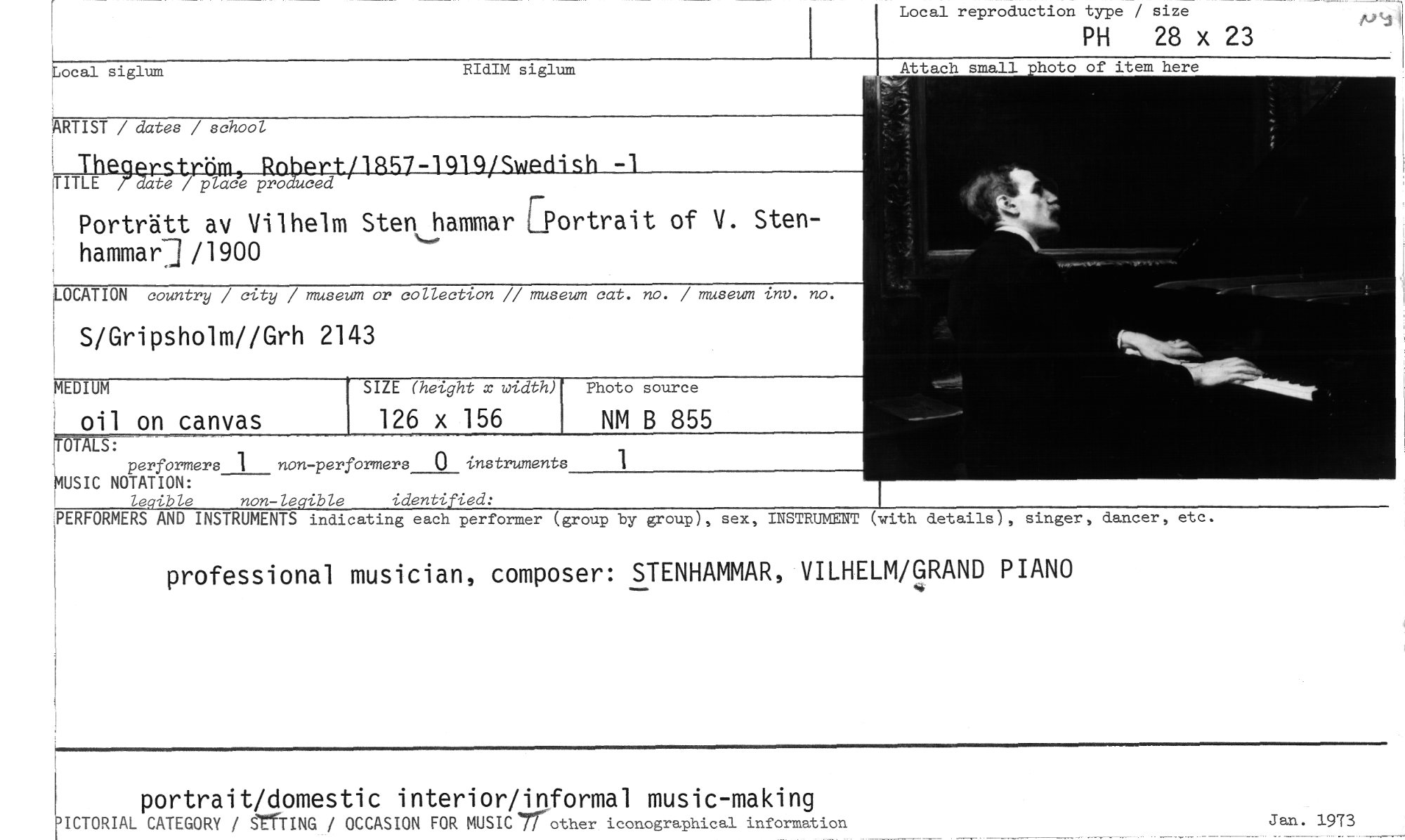 //// portrait/domestic interior/informal music-making DICTORIAL CATEGORY / STING / OCCASION FOR MUSIC7rother iconographical information //// Jan. 1973 //// Local reproduction type / size //// PH 28 x 23 //// ocal siglum RIdIM siglum //// ARTIST / dates / school //// Thegerstrdw, Rnbertrig57-1q1q/Swedish -1 //// TITLE /-date / place produced //// Porträtt av Vilhelm Stenjammar [Portrait of V. Stenhammar7j/1900 //// LOCATION country / city / museum or collection // museum cat. no. / museum inv. no. //// S/Gripsholm//Grh 2143 //// MEDIUM //// oil on canvas //// SIZE (height x width) Photo source //// 126 x 156 NM B 855 //// OTALS: //// parformers 1 non-parformers 0 instruments 1 //// USIC NOTATION: //// leqible non-leqible identified: //// PERFORMERS AND INSTRUMENTS indicating each performer (group by group), sex, INSTRUMENT (with details), singer, dancer, etc. //// professional musician, composer: STENHAMMAR, VILHELM/GRAND PIANO ////