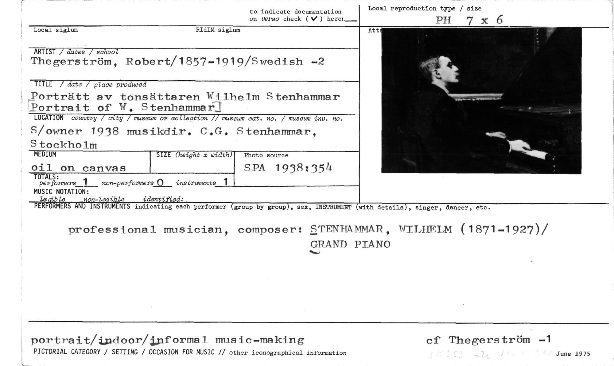 //// Local reproduction type / size //// PH 7 x //// to indicate documentation //// on verso check ( ) here:._ //// Local siglum RIdIM siglum //// ARTIST / dates / school //// Thegerström, Robert/1857-1919/Swedish -2 //// TITLE / date / place produced //// Porträtt av tonsättaren Wilhelm Stenhammar Portrait of W. Stenhammar] //// LOCATION country / city / museum or collection // museum cat. no. / museum inv. no. //// S/owner 1938 musikdir. C.G. Stenhammar, Stockholm //// SIZE (height x width) //// TOTAS : //// per formers 1 non -performers () instruments 1 //// MEDIUM //// oil on canvas //// Photo source //// SPA 1938:354 //// Att //// MUSIC NOTATION: //// 4saible non-leaible idanti4ed: //// PERFORMERS AND INSTRUMENTS indicating each performer (group by group), sex, INSTRUMENT //// (with details), singer, dancer, etc. //// professional musician, composer: STENHAMMAR, wILHELM (1871-1927)/ //// GRAND PIANO //// portrait/ipdoor/Informal music-making cf Thegerström -1 June 1975 //// PICTORIAL CATEGORY / SETTING / OCCASION FOR MUSIC // other iconographical information //// ////