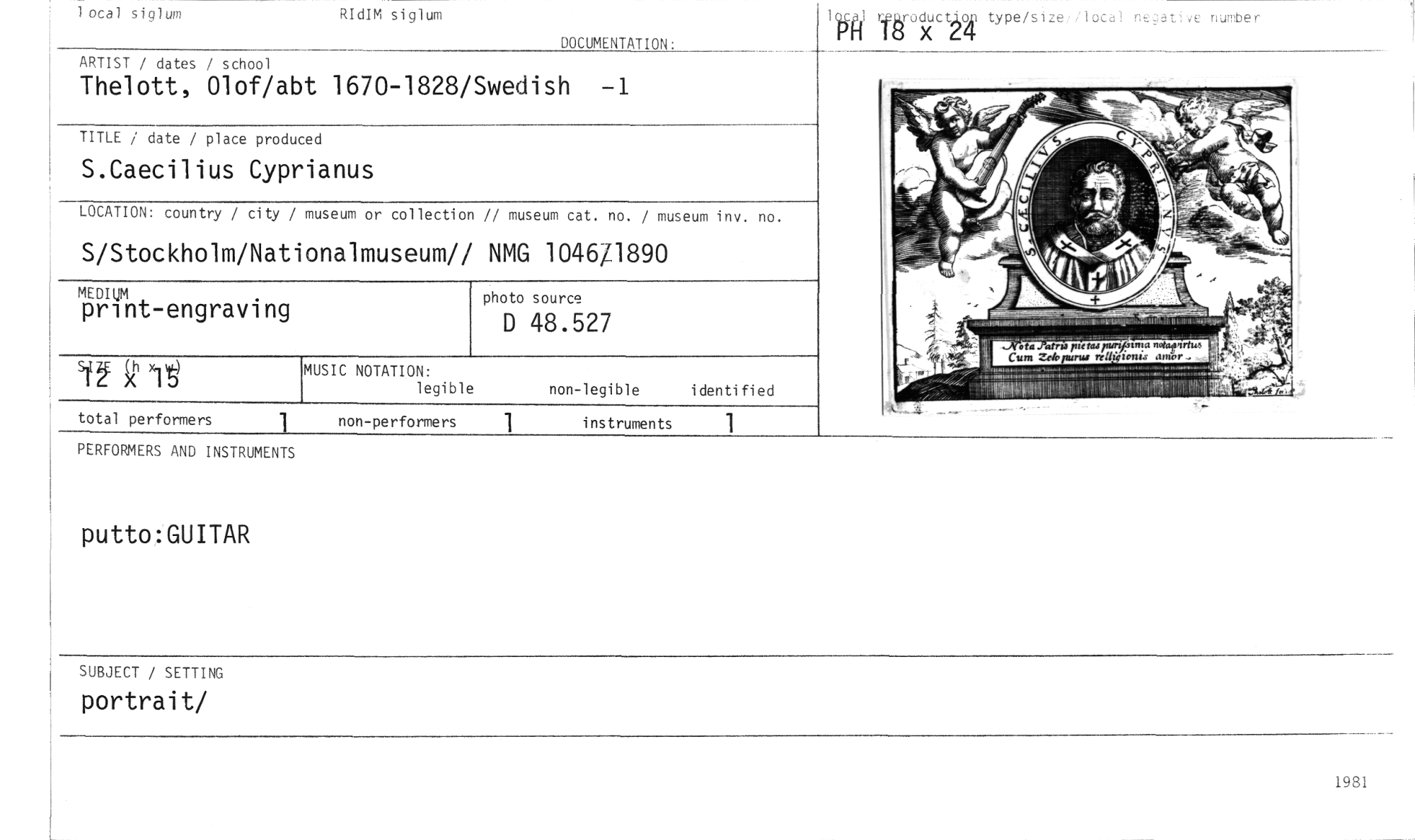 //// I tik cfikroductiok type/s i ze loc al n urnbe r //// I ö X CLF //// DOCUMENTATION: //// local siglum RIdIM siglum //// ARTIST / dates / school //// Thelott, Olof/abt 1670-1828/Swedish -1 //// TITLE / date / place produced //// S.Caecilius Cyprianus //// LOCATION: country / city / museum or collection // museum cat. no. / museum inv. no. //// S/Stockholm/Nationalmuseum// NMG 104671890 //// photo source //// D 48.527 //// sff t //// instruments 1 //// MEDIUM //// print-engraving //// MUSIC NOTATION: //// legible //// non-legible identified //// total performers //// 1 //// non-performers //// PERFORMERS AND INSTRUMENTS //// putto:GUITAR //// SUBJECT / SETTING //// portrait/ //// 1981 ////